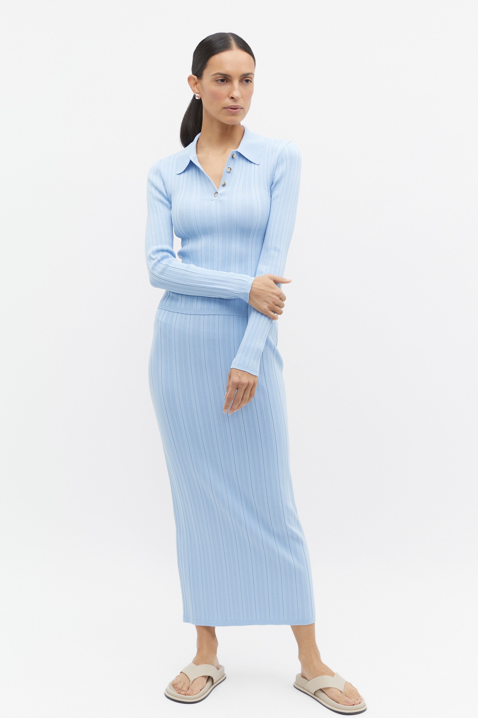 Comfortable and easy to style, this knit midi skirt is a versatile addition to any wardrobe. It features an elasticated waistband, a variegated rib texture, and a straight shape. Pair it with the matching cropped polo for a coordinated look.