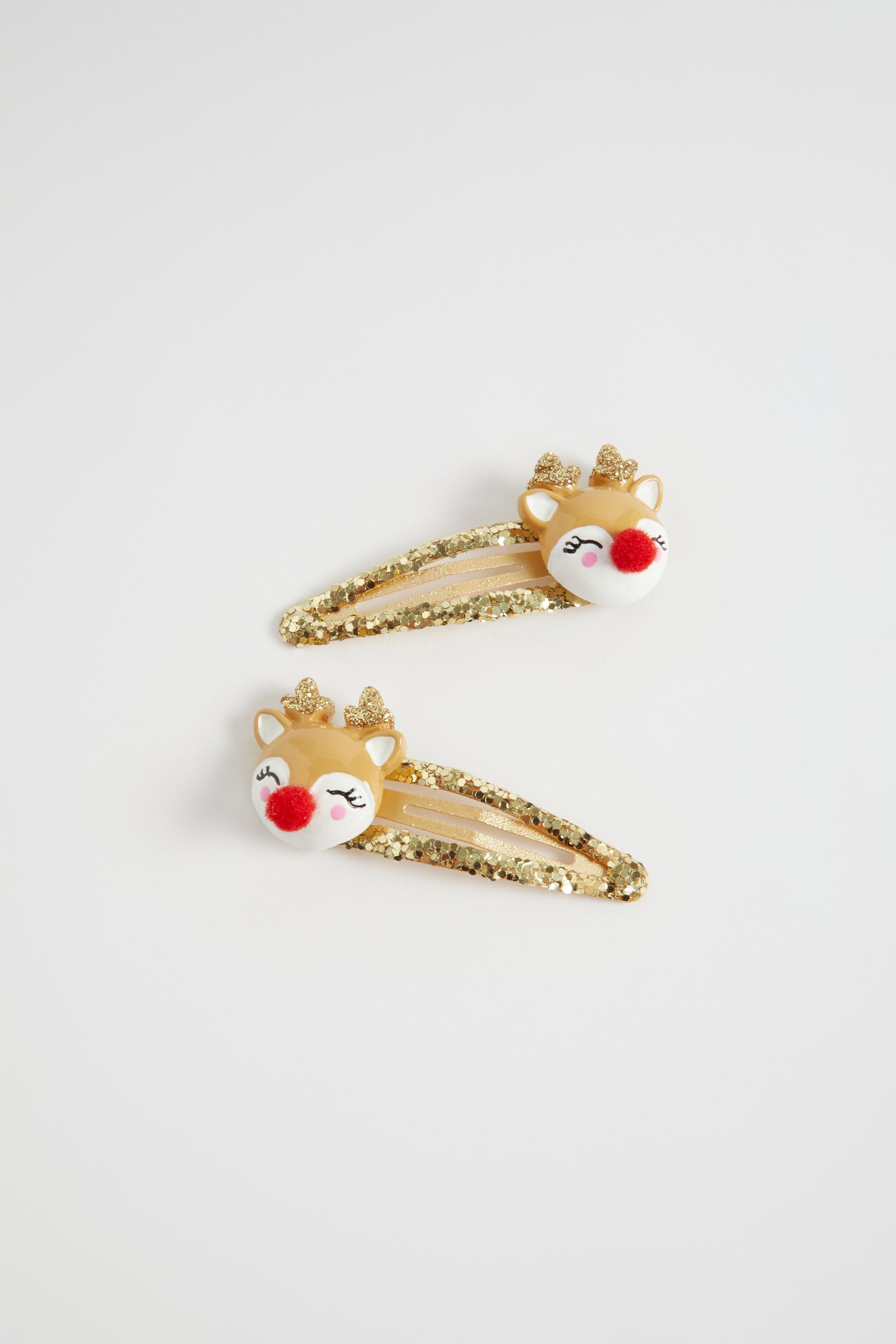 These pretty snap clips feature a Rudolph design with a touch of glitter. They come in a handy pack of two. This product is not a toy and not suitable for children 3 years and under.