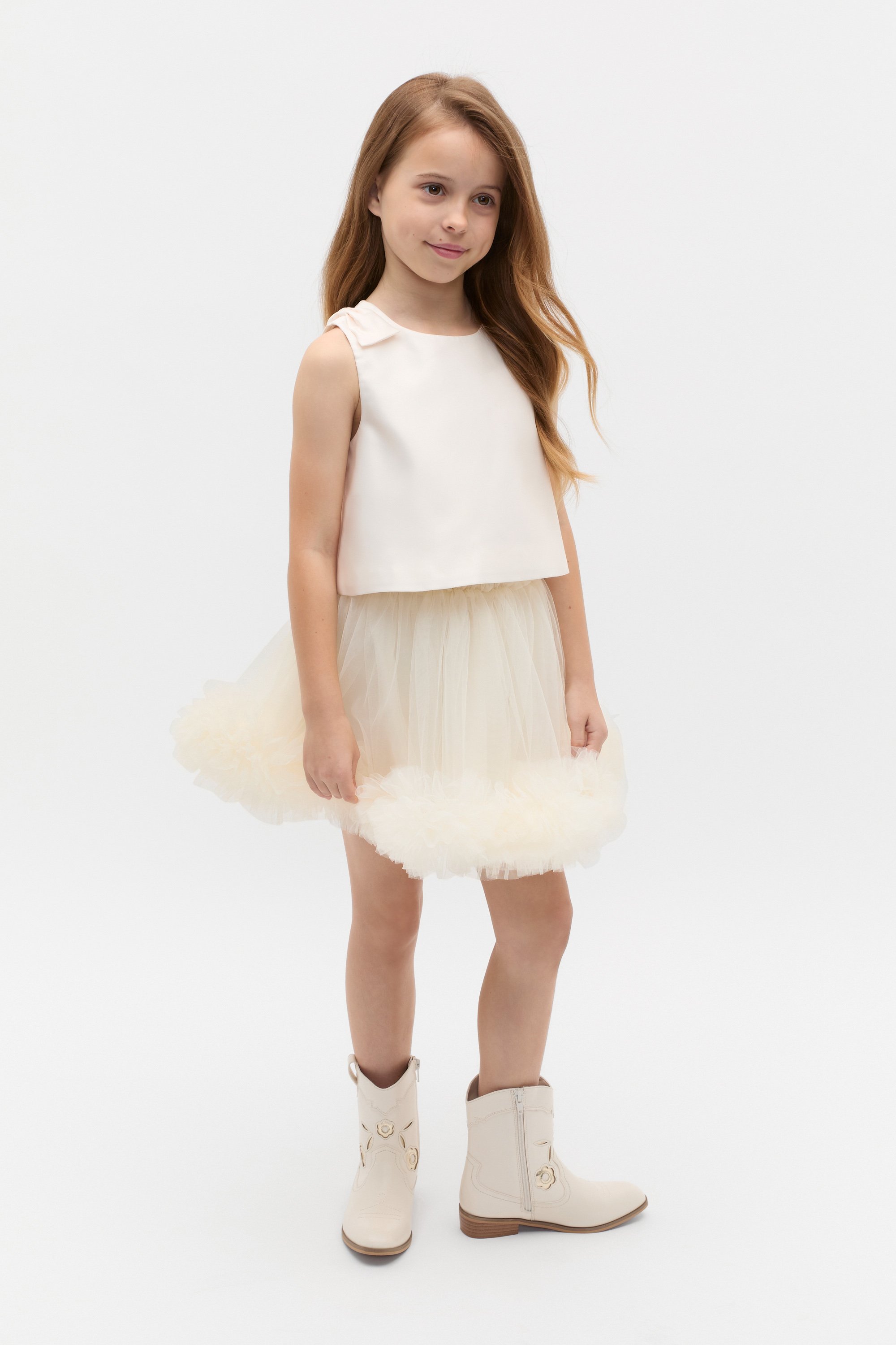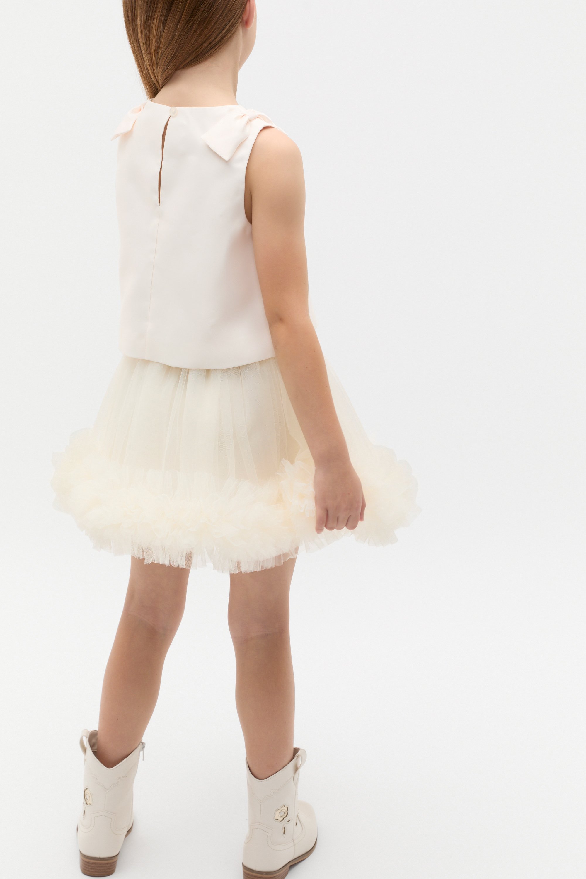 Designed for special occasions, this satin top is a statement style with the sweetest bow details. It has a sleeveless shape, a round neck and a bow on each shoulder. Fully lined, it secures with a button at the back of the neck. Pair with matching blue styles to complete her party look.