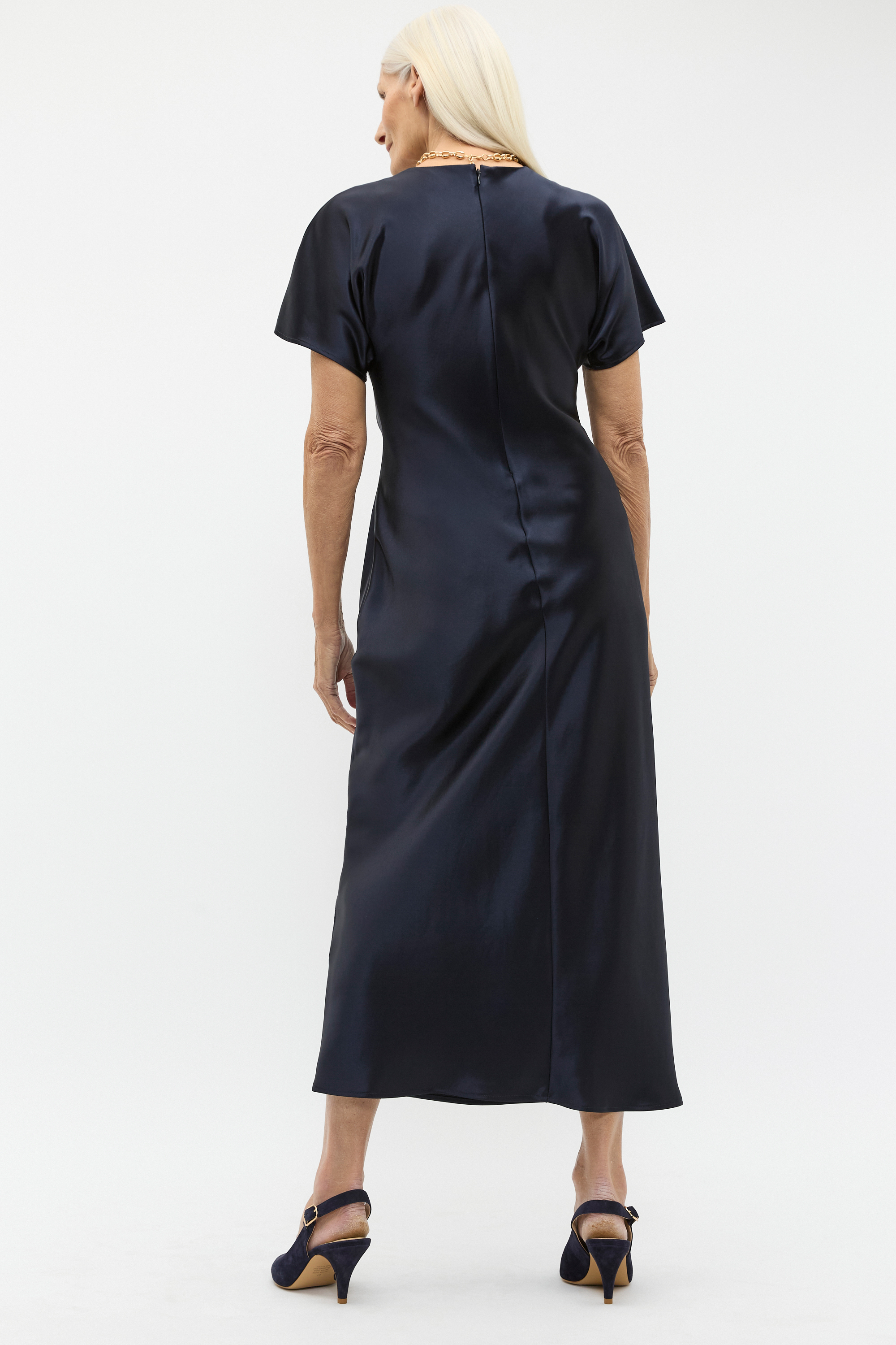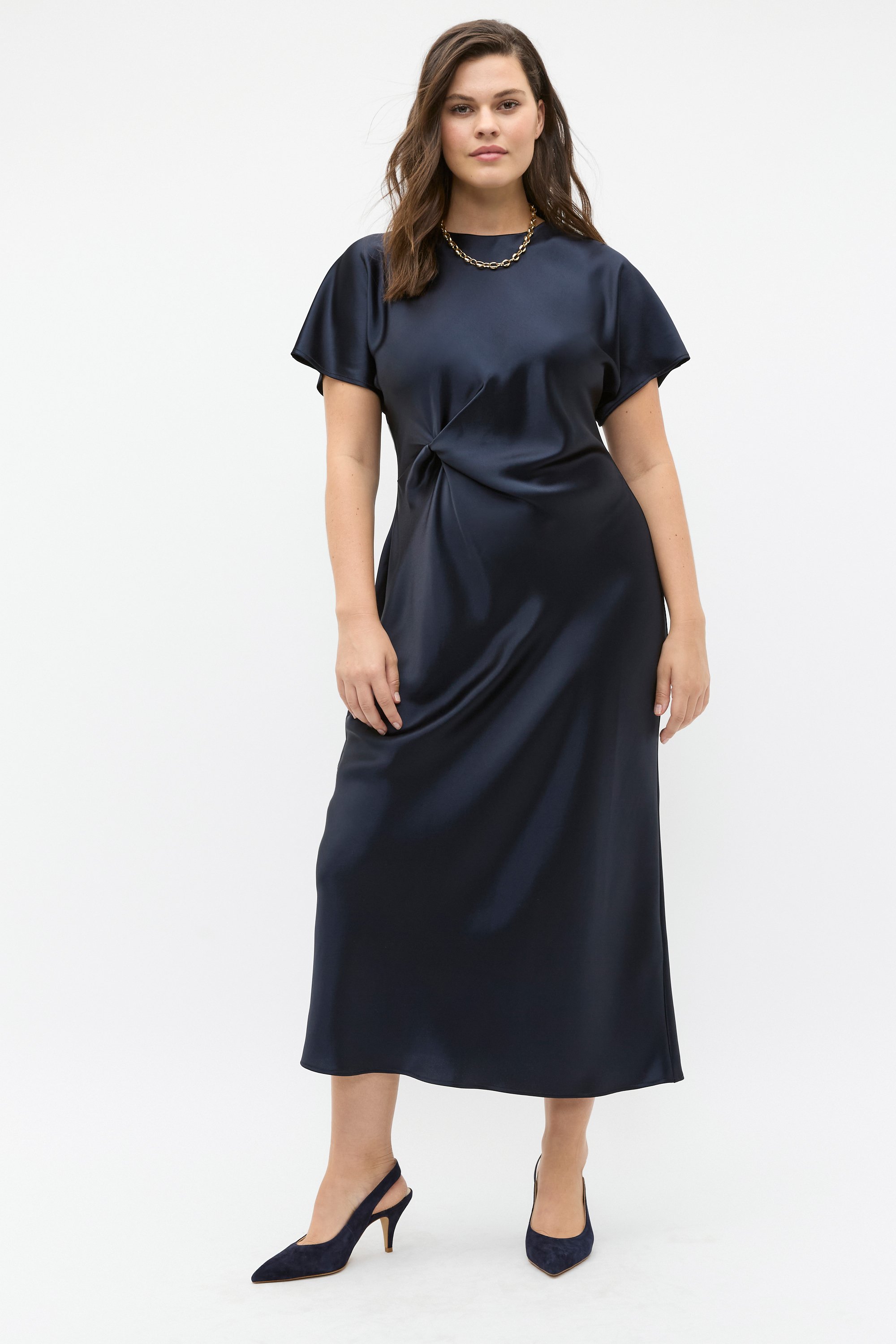 Add effortless elegance to your evening wardrobe with this sleek and simple satin dress. With a smooth luxe finish, it features a round neck, kimono sleeves and a subtle fit and flare design through the body. It has a knotted detail at the waist offering a shaped silhouette and secures at the rear with an invisible zip.