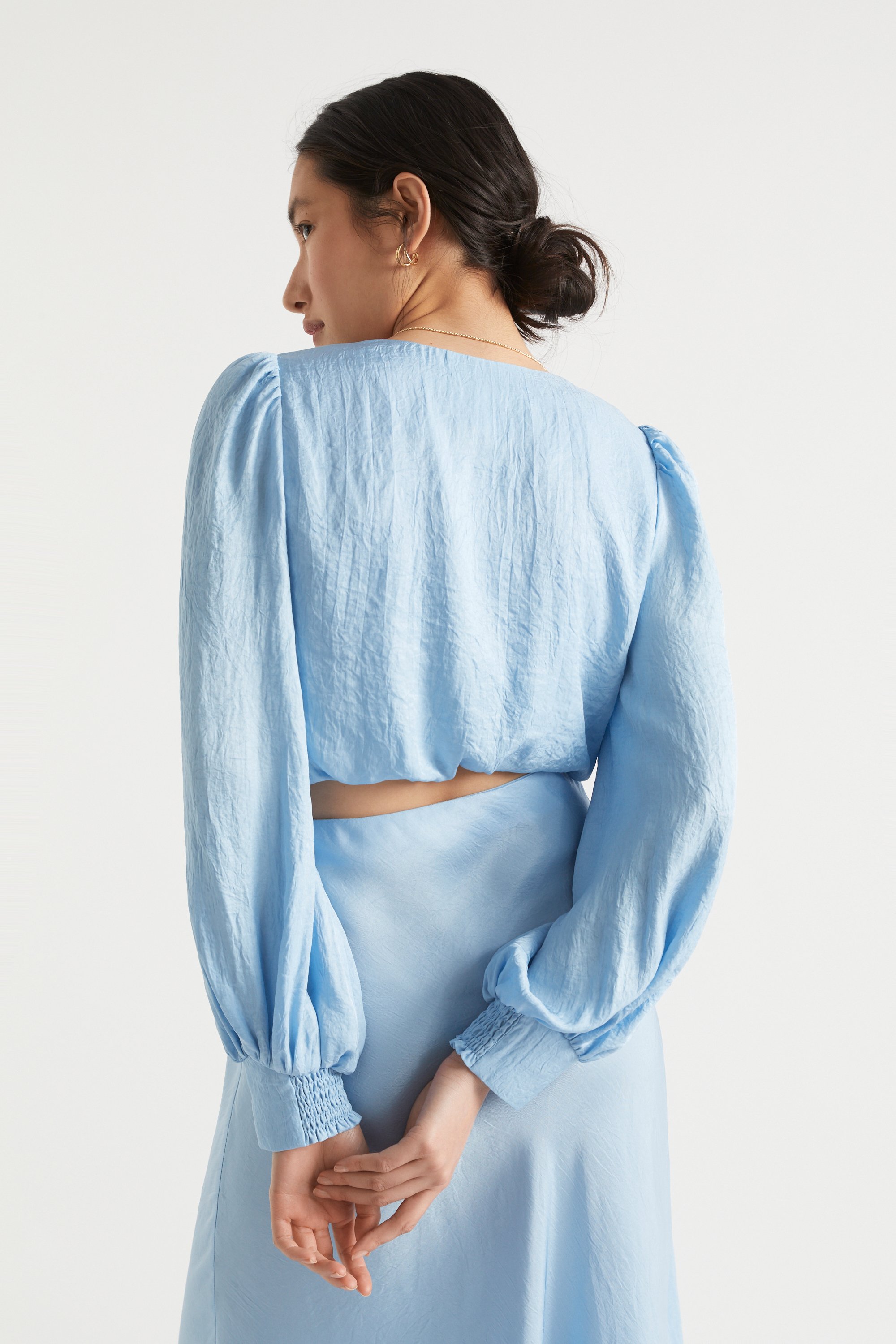 Dress up with this elegant twist-front top. With balloon sleeves and a cropped length, the top has an elevated feel, ideal for evening wear. The top is crafted from a satin fabric and its bodice is lined.
