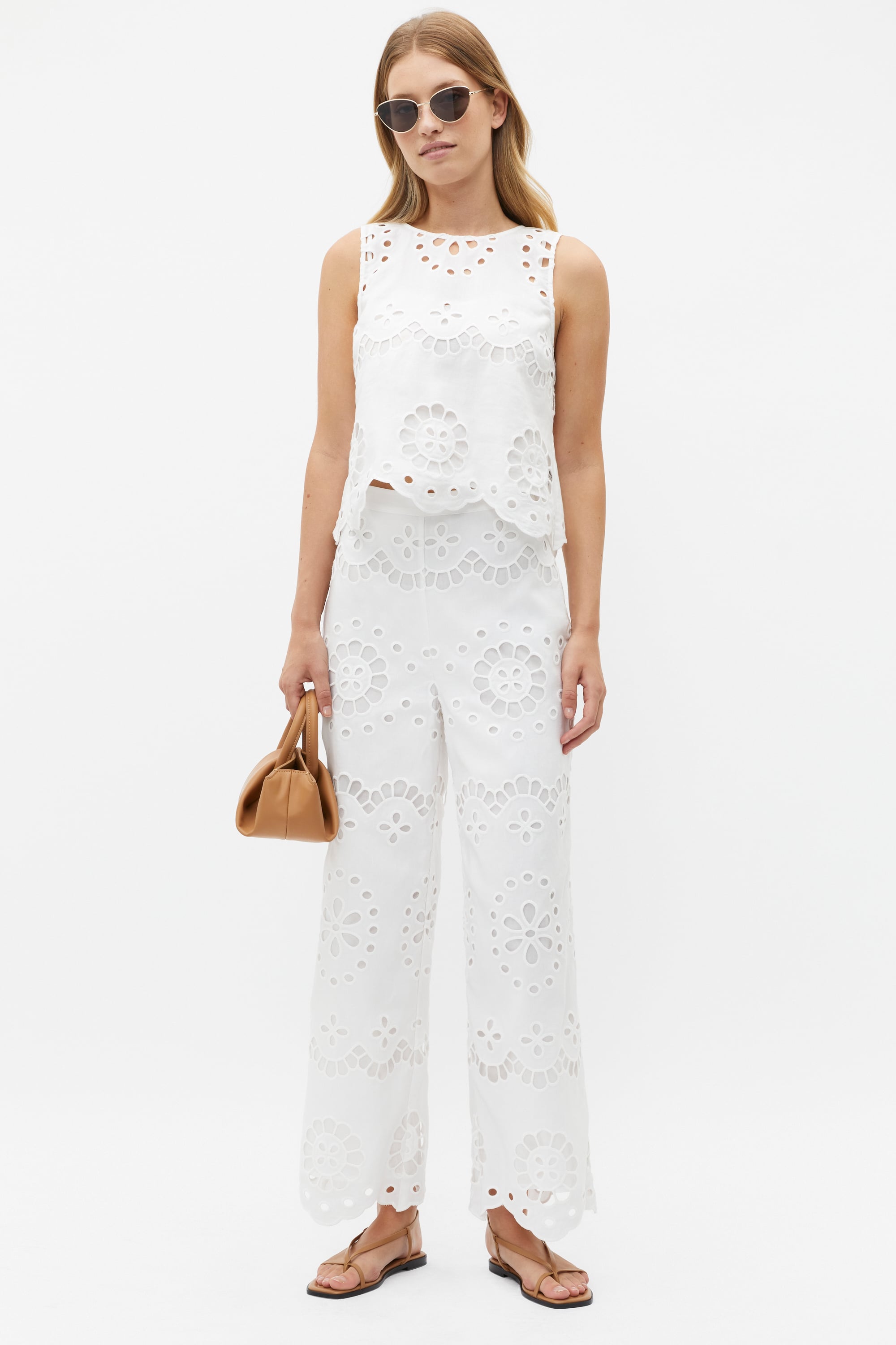 A chic statement for your summer outings, these pants are the ideal styling piece. They feature a fixed waistline with a side zip, broderie details, a scallop trim and a wide leg shape. Pair with the matching top for a curated head-to-toe look.