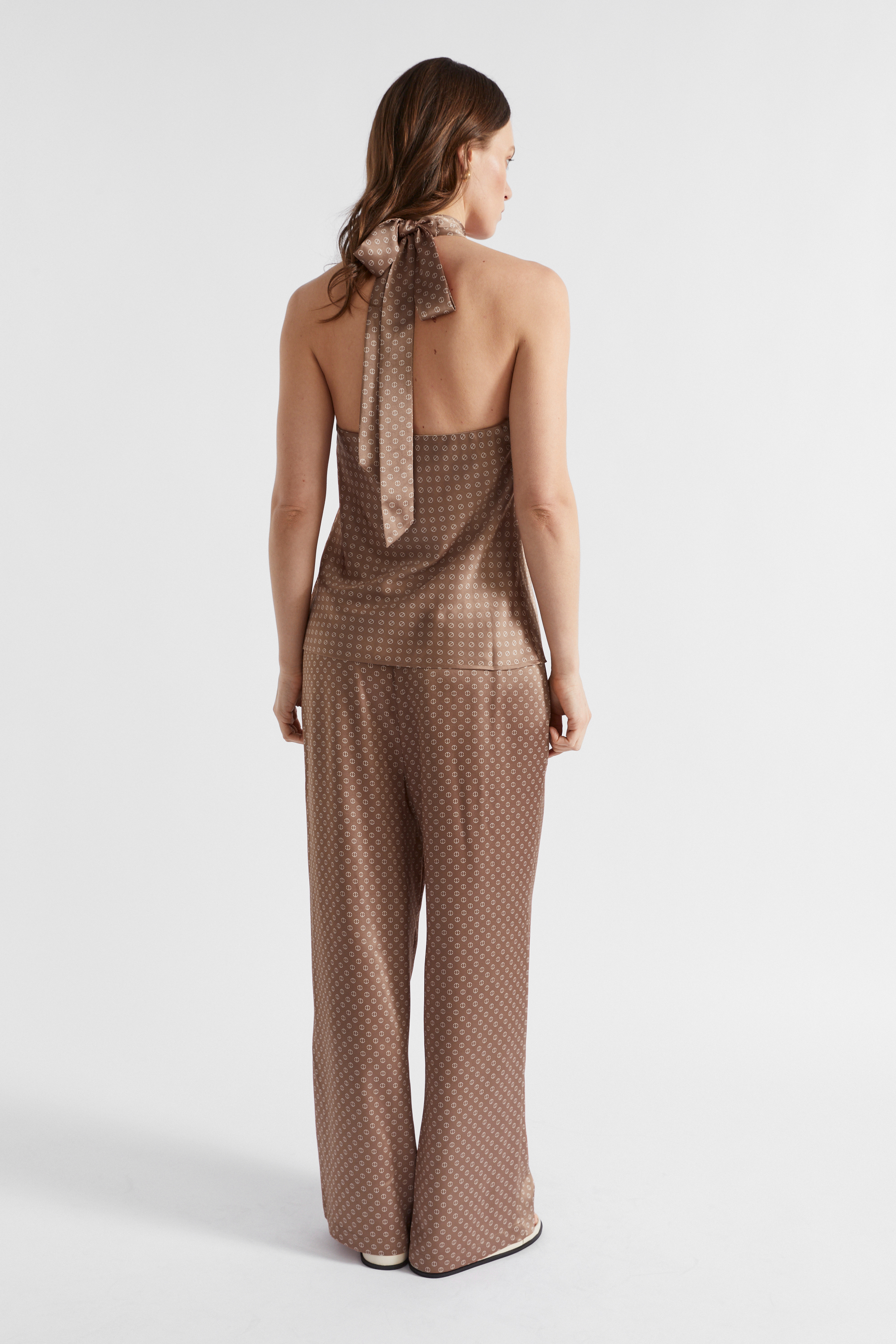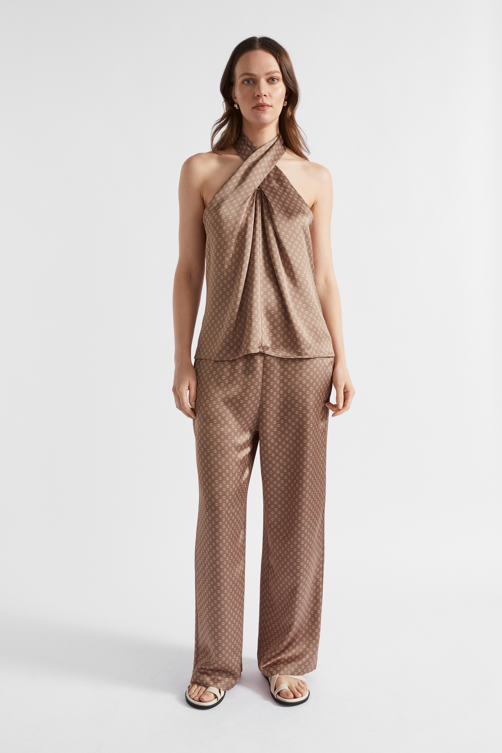 This top has a statement crossover halter neck and a fluid, flattering cut. Featuring a small-scale scarf print, it is crafted from a satin blend. Pair with the matching trousers for a complete look.