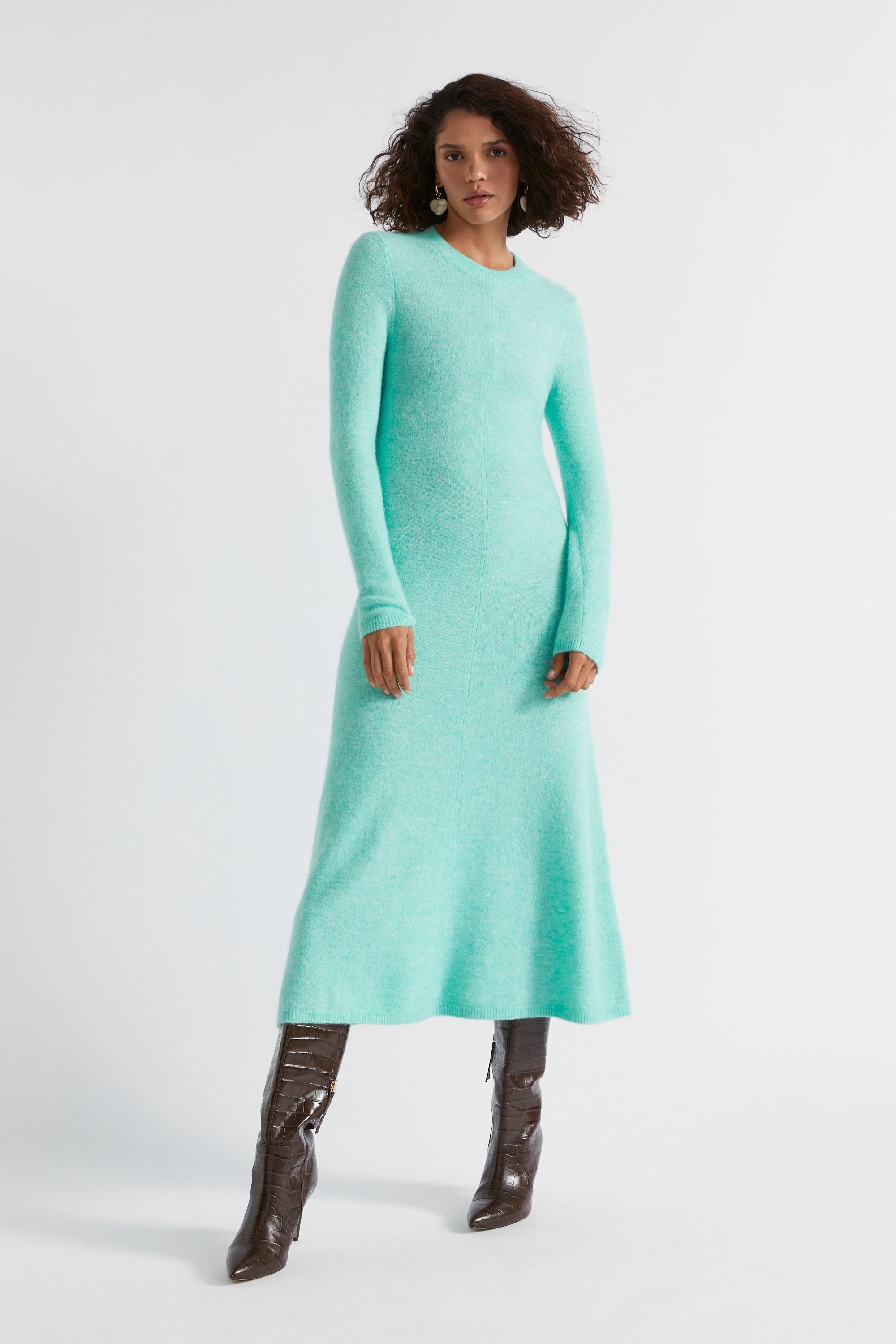 An instant outfit for those cooler days, this knit dress features a round neck, long sleeves, a vertical seam detail, ribbed trims, and a slight A-line shape through the skirt. In an easy midi length, it is crafted from a soft-feel blend with wool and alpaca.