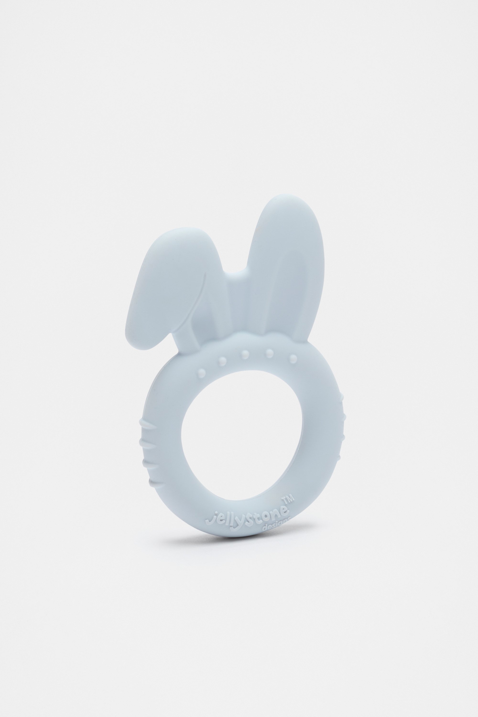 Shaped as a little bunny, this teething toy is crafted in soft silicone with an easy grip handle.