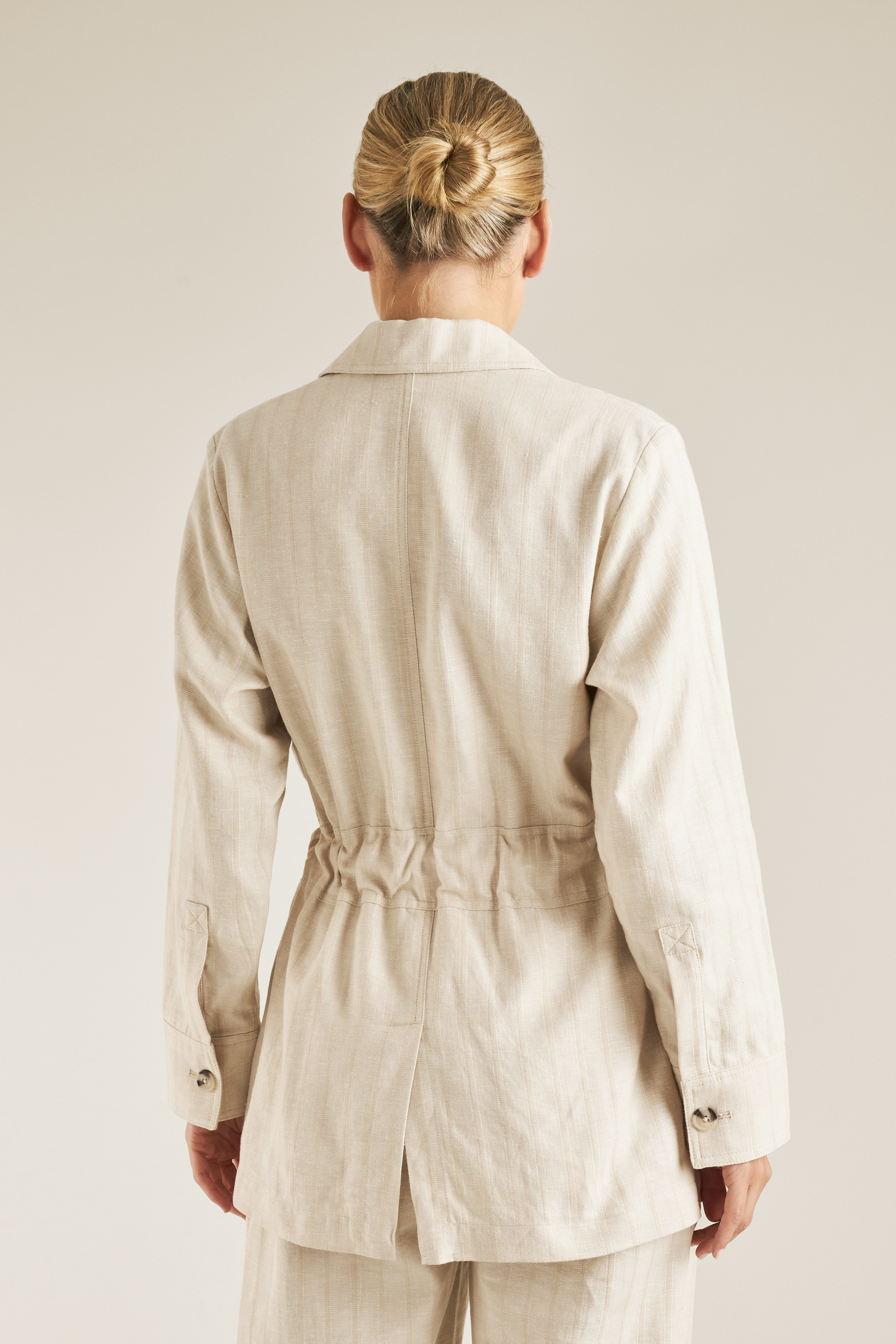 Made from a breathable cotton/linen blend, this Self Stripe Jacket features a collared lapel, long sleeves, waist tie, side pockets and structured silhouette.