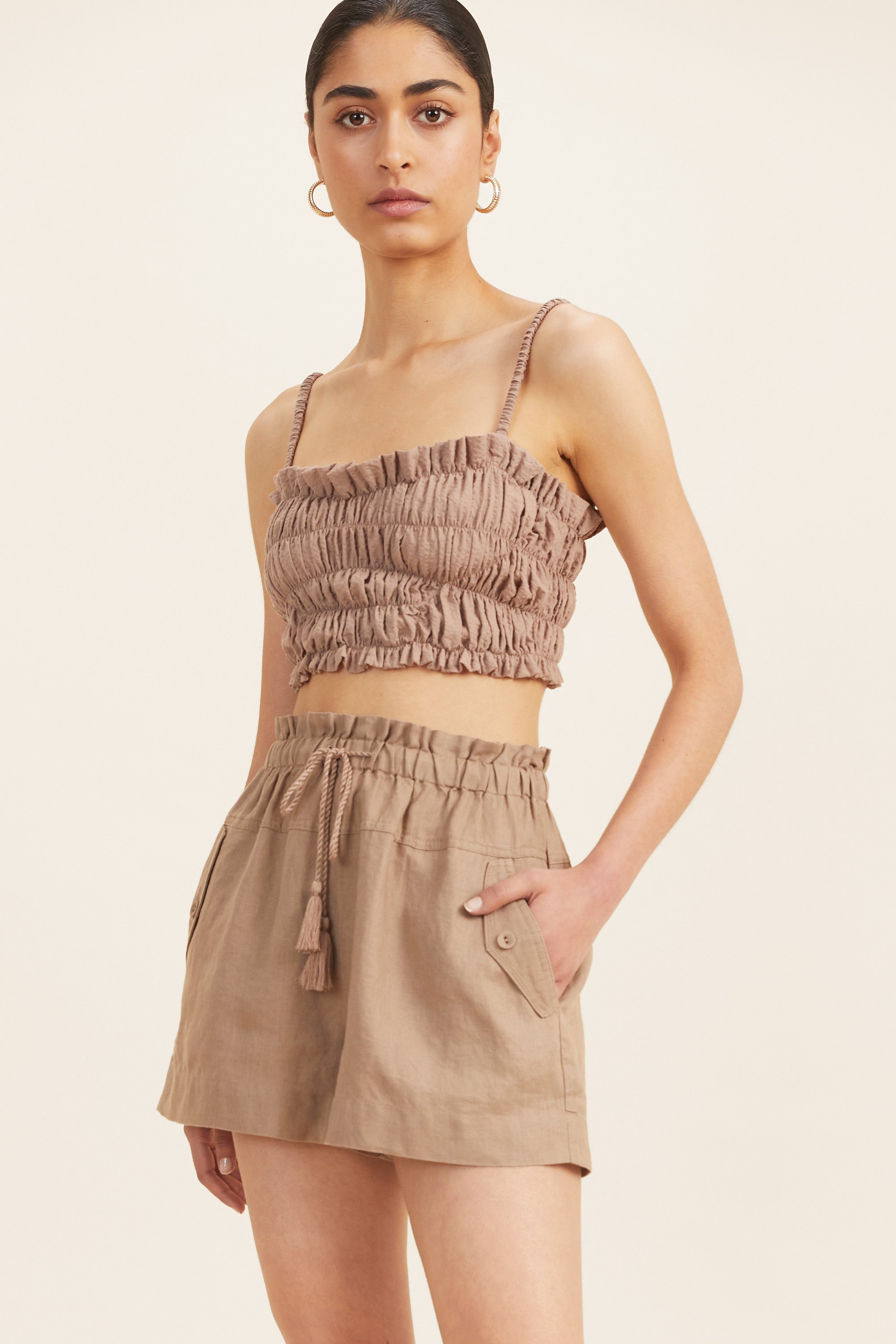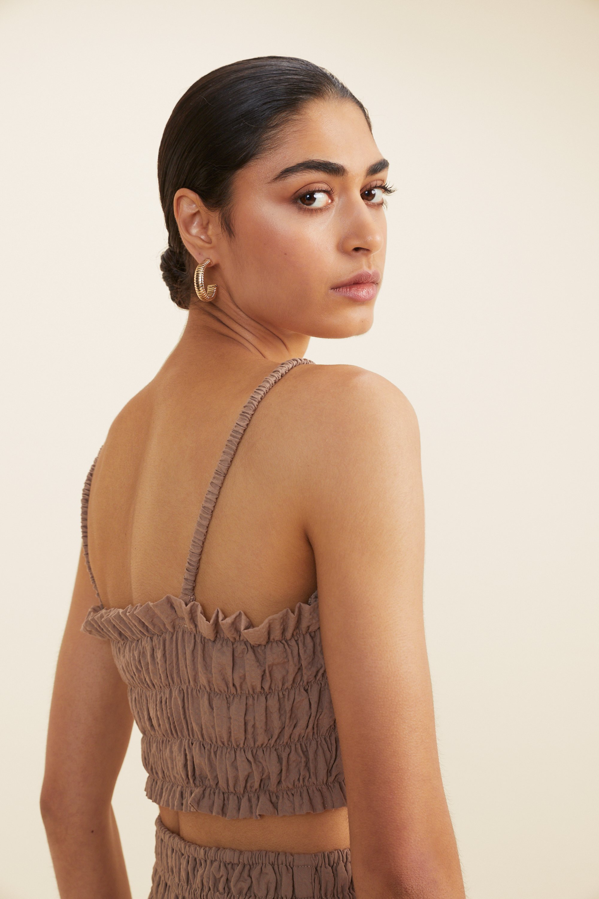 Designed with sweeping stitching lines and a ruched finish, this crop top is the perfect building block for any occasion outfit. The textured, cotton blend material sits neatly to the body with elasticated seams, and the top features a frill at the neckline and waist, with thin shoulder straps that are both adjustable and removable.