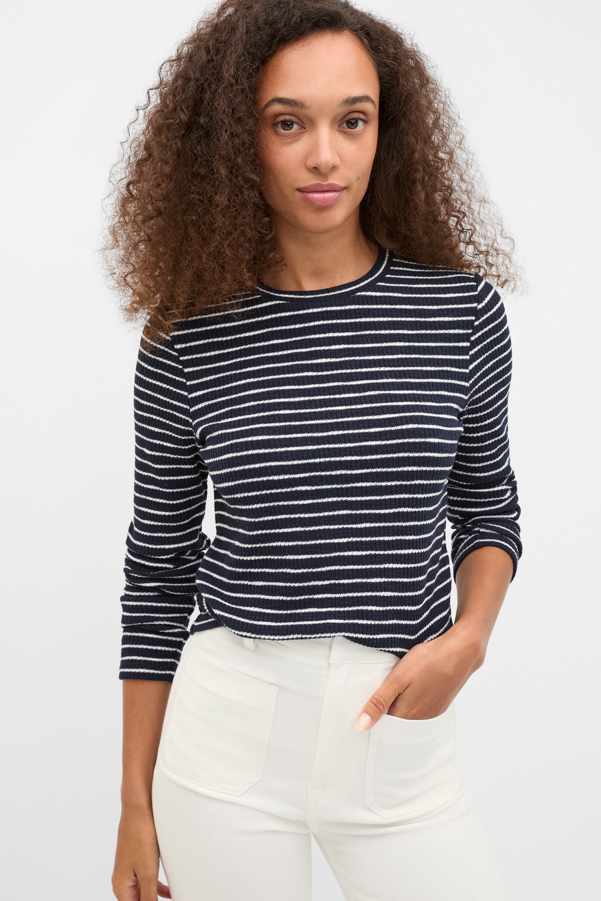 Perfect for layering, this top is a comfortable style for your transeasonal wardrobe. Crafted in a soft blend containing cotton, it features a round neck, long sleeves and a stripe design.