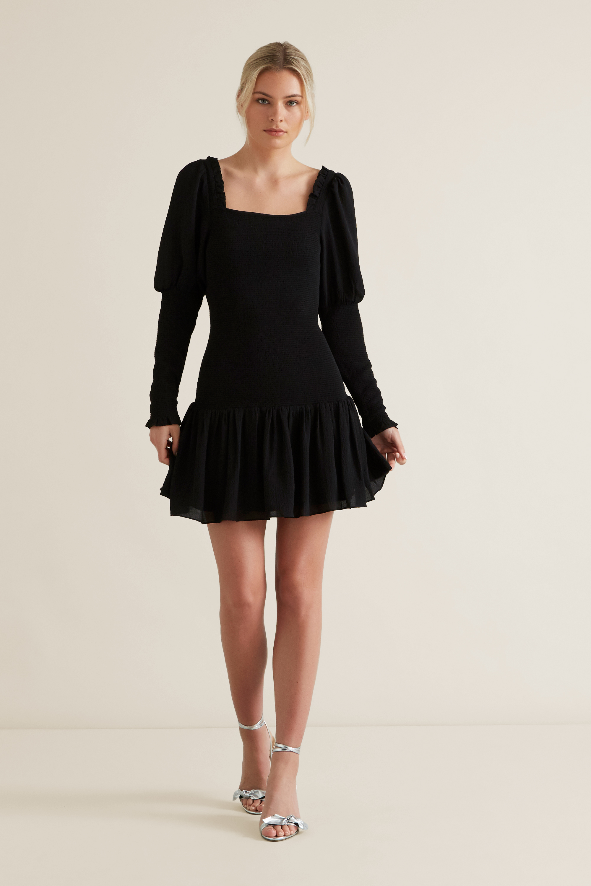 Designed with exaggerated sleeves, this Shirred Body Dress is the little black dress of your dreams. Made from a Polyester blend, it features a square neckline, detailed with long shirred and puff sleeves, fitted bodice and a flowy frill hemline. Available in sizes 6 to 16, our model is 177 cm and wears a size 8. For care information, check the label inside of the garment.
