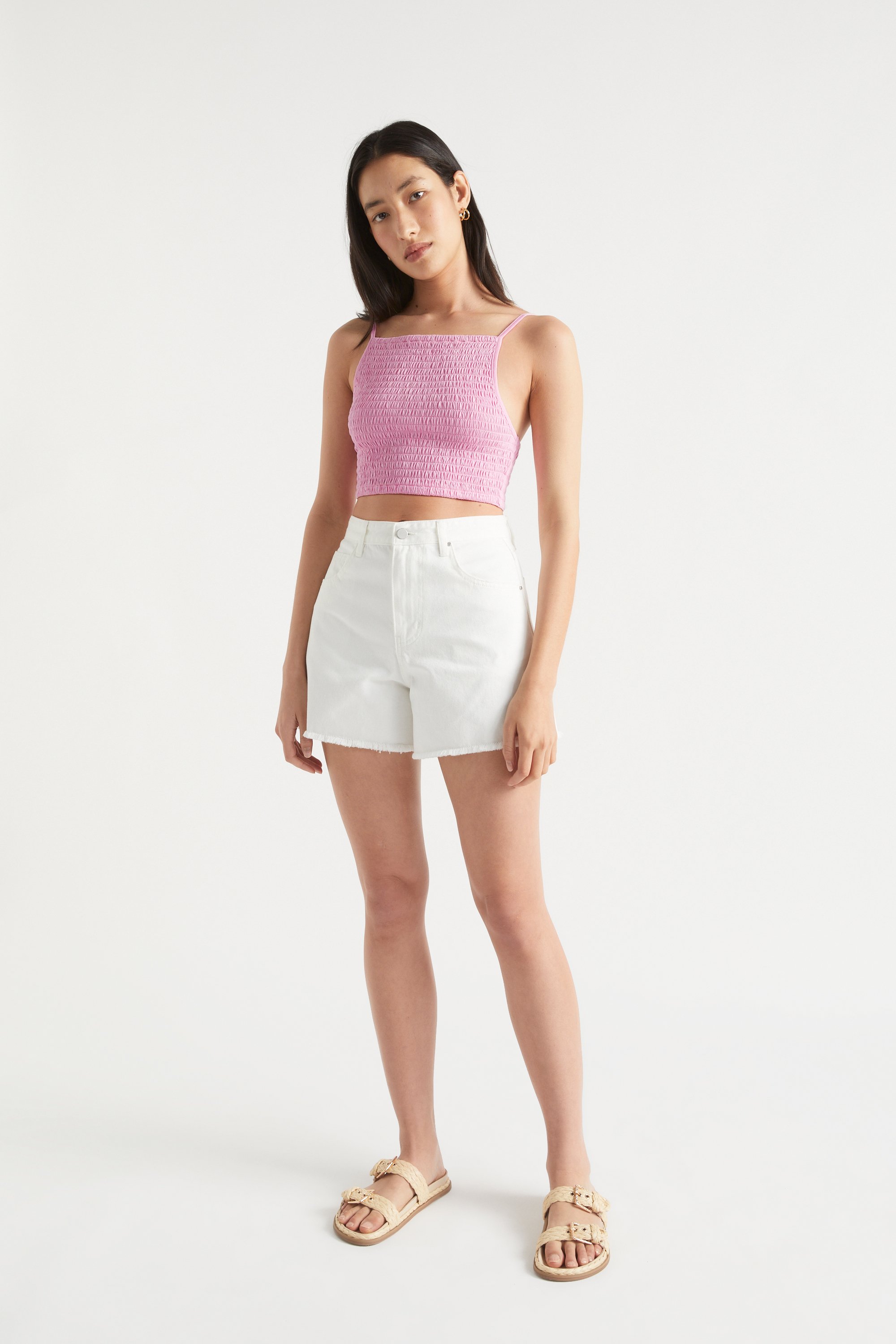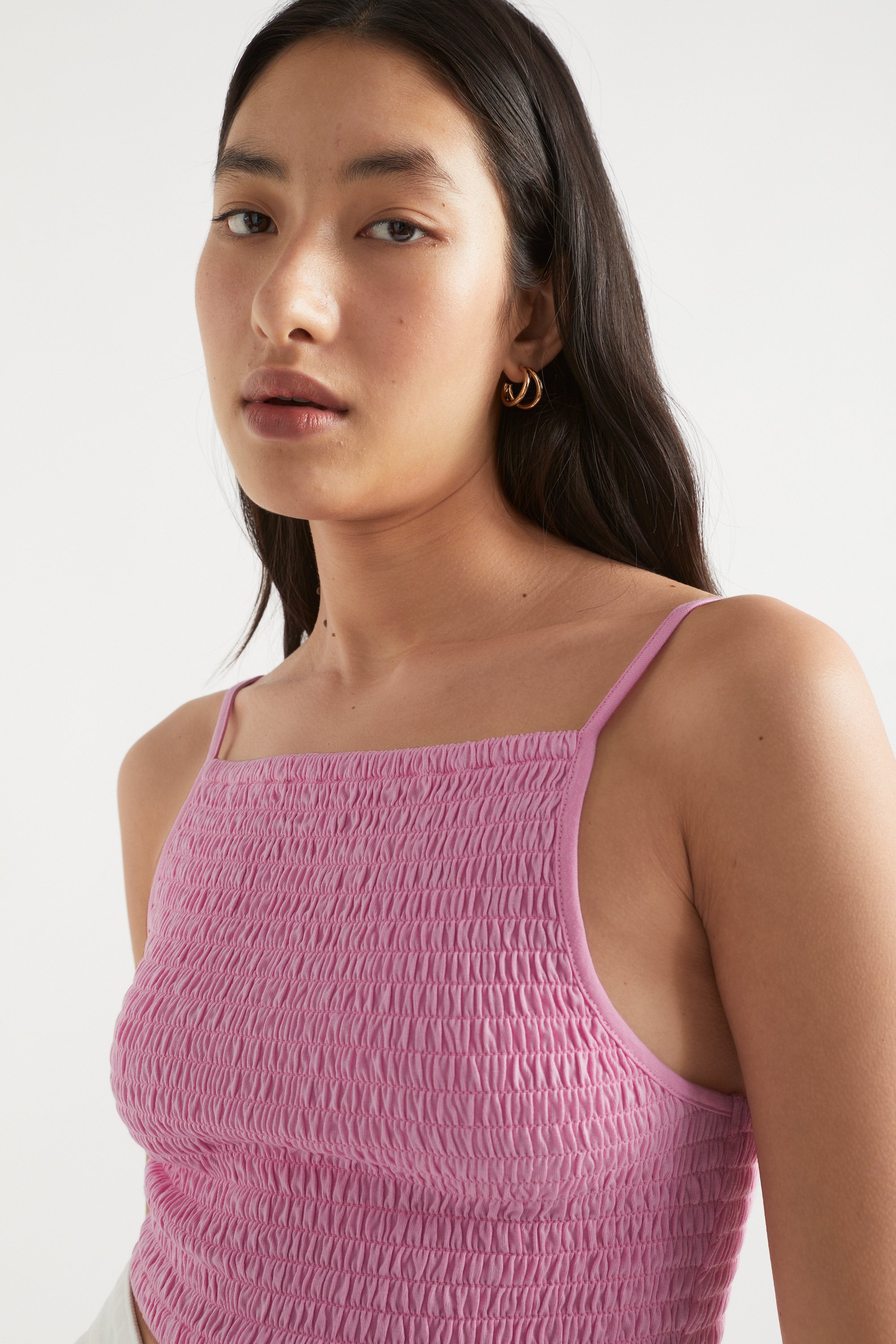 Crafted from a soft cotton modal jersey, this crop top is shirred all over and features slim straps. With a square neckline and neat fit, it is a must for holiday dressing and beyond. By choosing our cotton products, you are supporting our investment in the Better Cotton mission.
