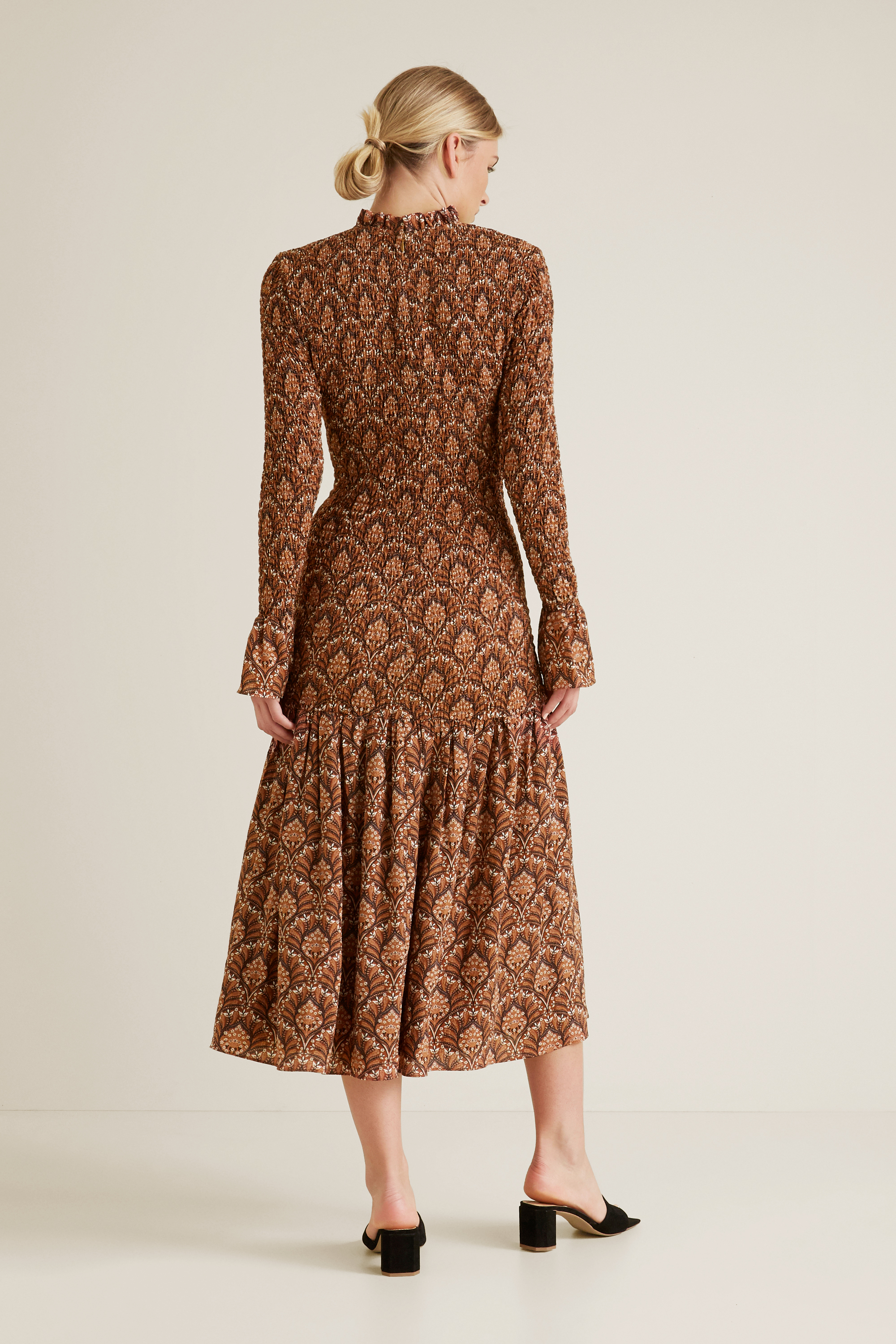 This Shirred Maxi Dress pays homage to an era of opulent design and printed silhouettes. Featuring a frilled high neckline, this maxi dress is detailed with shirred sleeves, flared cuffs, shirred body and a flowy dropped hemline. For your reference, our model is 177 cm tall and wears a size 8. Check the label inside of the garment for care instructions.