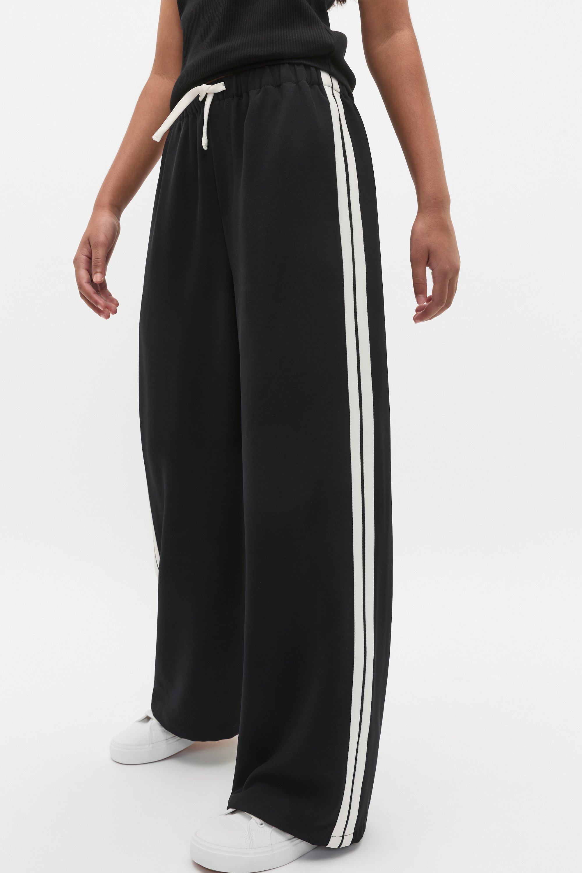 Designed for everyday comfort and effortless cool, this pants are ready to be worn on repeat. With a smooth finish, they feature an elasticated waistband with a drawstring, a loose-fitting straight leg shape and a side stripe for a sporty look.