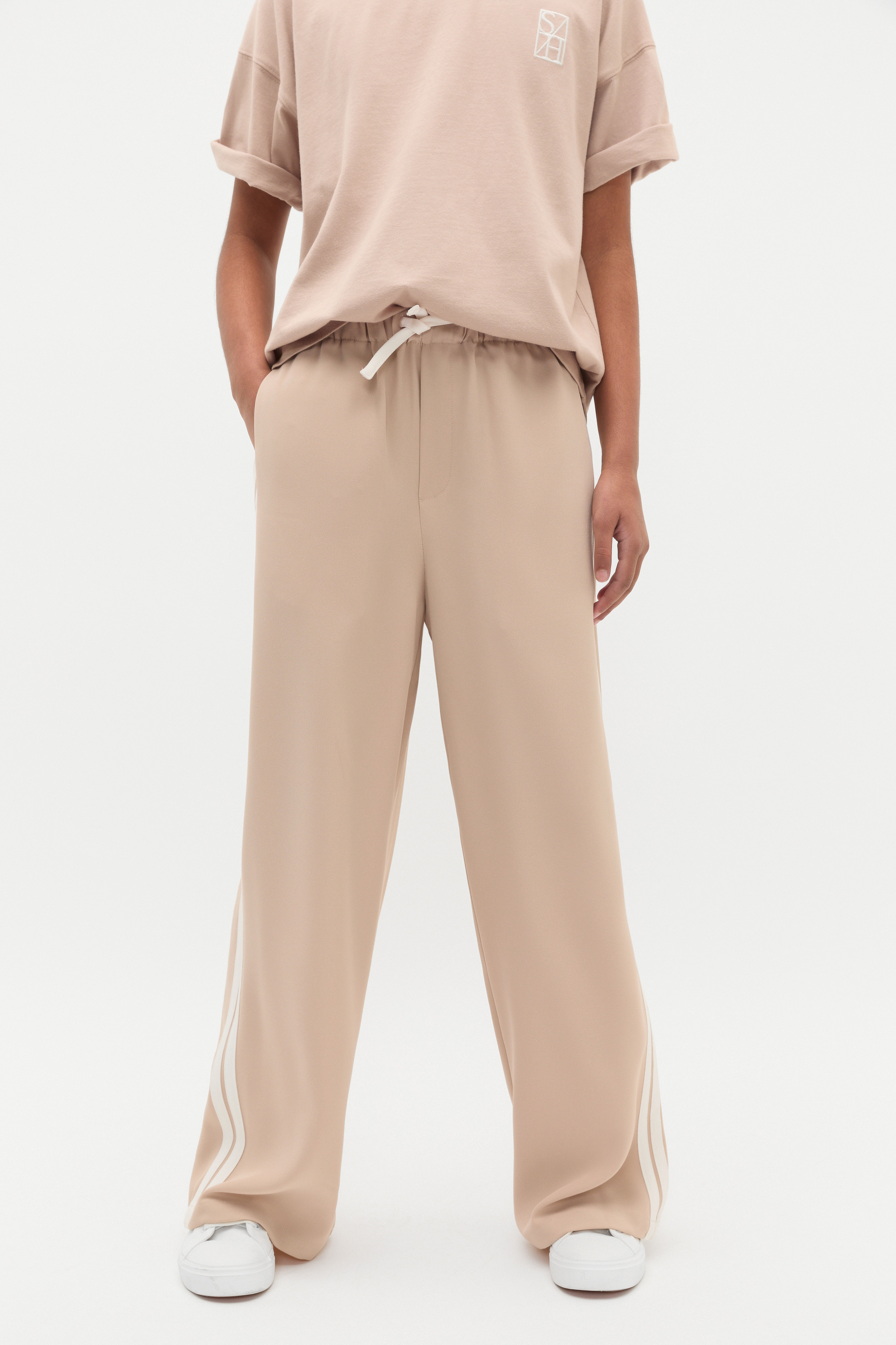 Designed for everyday comfort and effortless cool, this pants are ready to be worn on repeat. With a smooth finish, they feature an elasticated waistband with a drawstring, a loose-fitting straight leg shape and a side stripe for a sporty look.