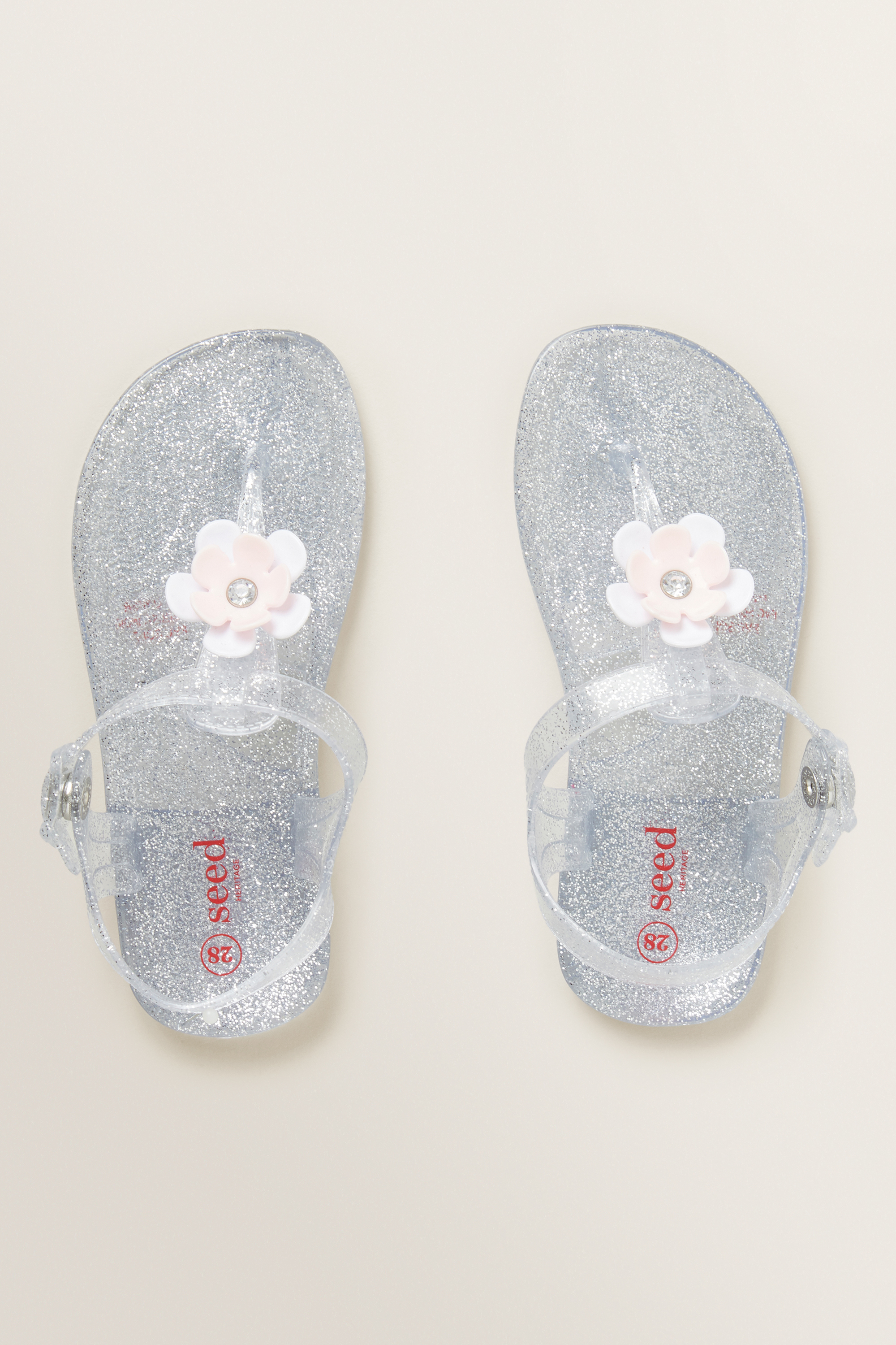 Designed with lustrous detailing, these Silver Jelly Sandals feature a soft jelly sole, ankle strap and flower detailing.
