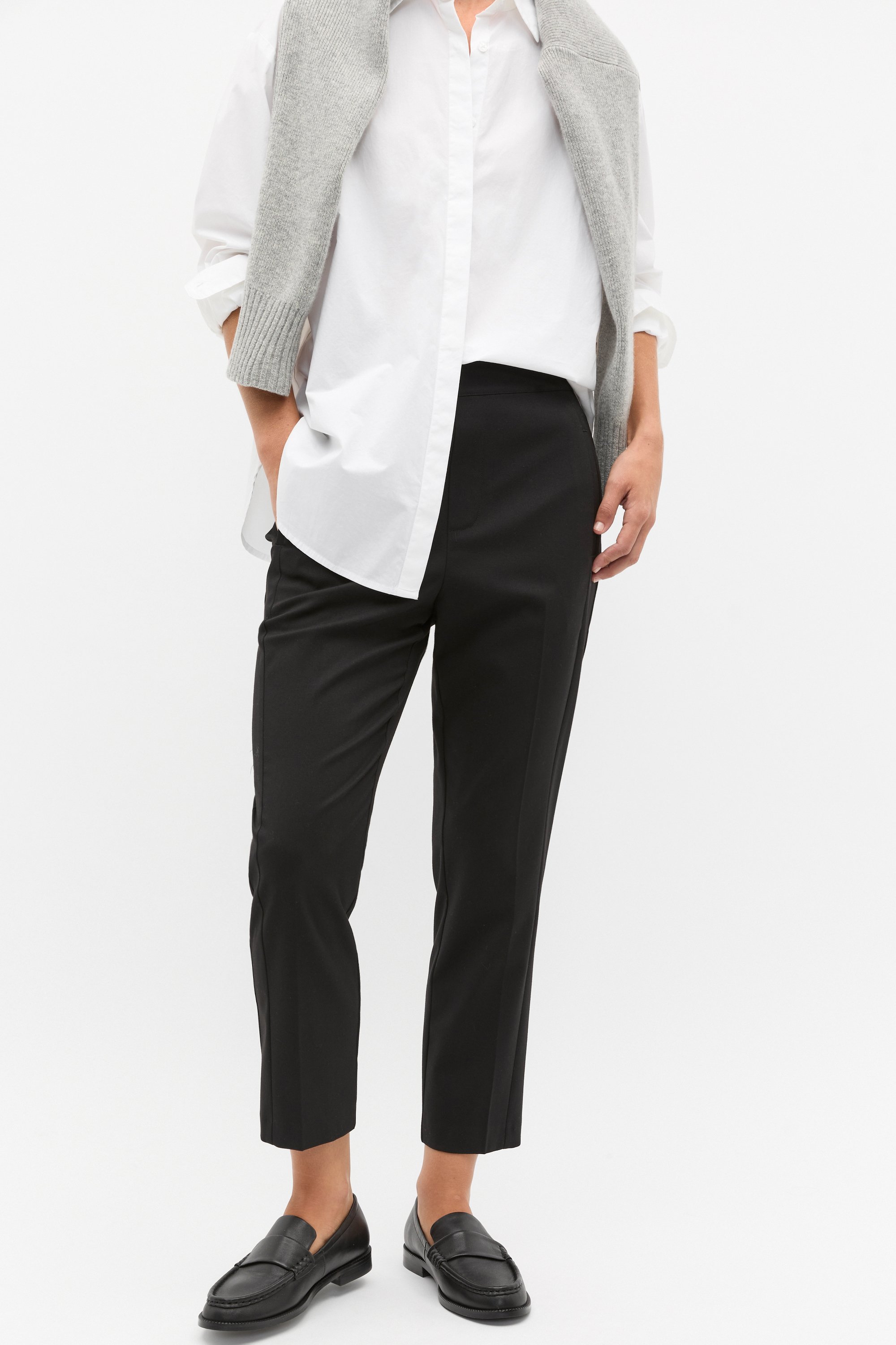 A staple for the modern wardrobe, these tapered-leg pants feature a flat-front waistband with an elasticated back, front pockets, with seam and crease details for added interest.