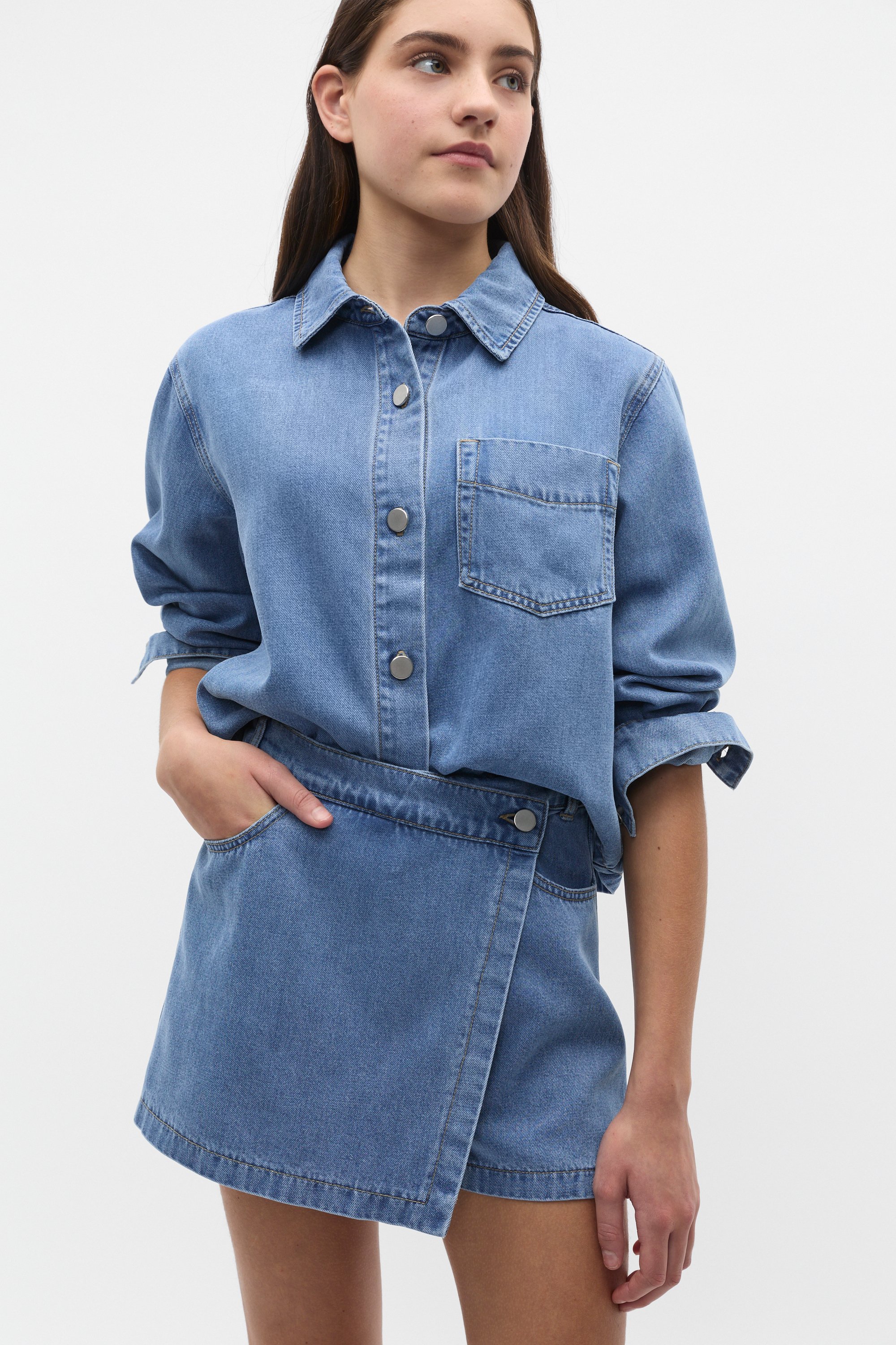 Versatile and always on-trend, this denim shirt is ready to pair with all her wardrobe favourites. In a soft cotton blend, it features a collar, long sleeves with button cuffs and a breast pocket. With a medium weight, this style is chic as either a shirt or shacket.
