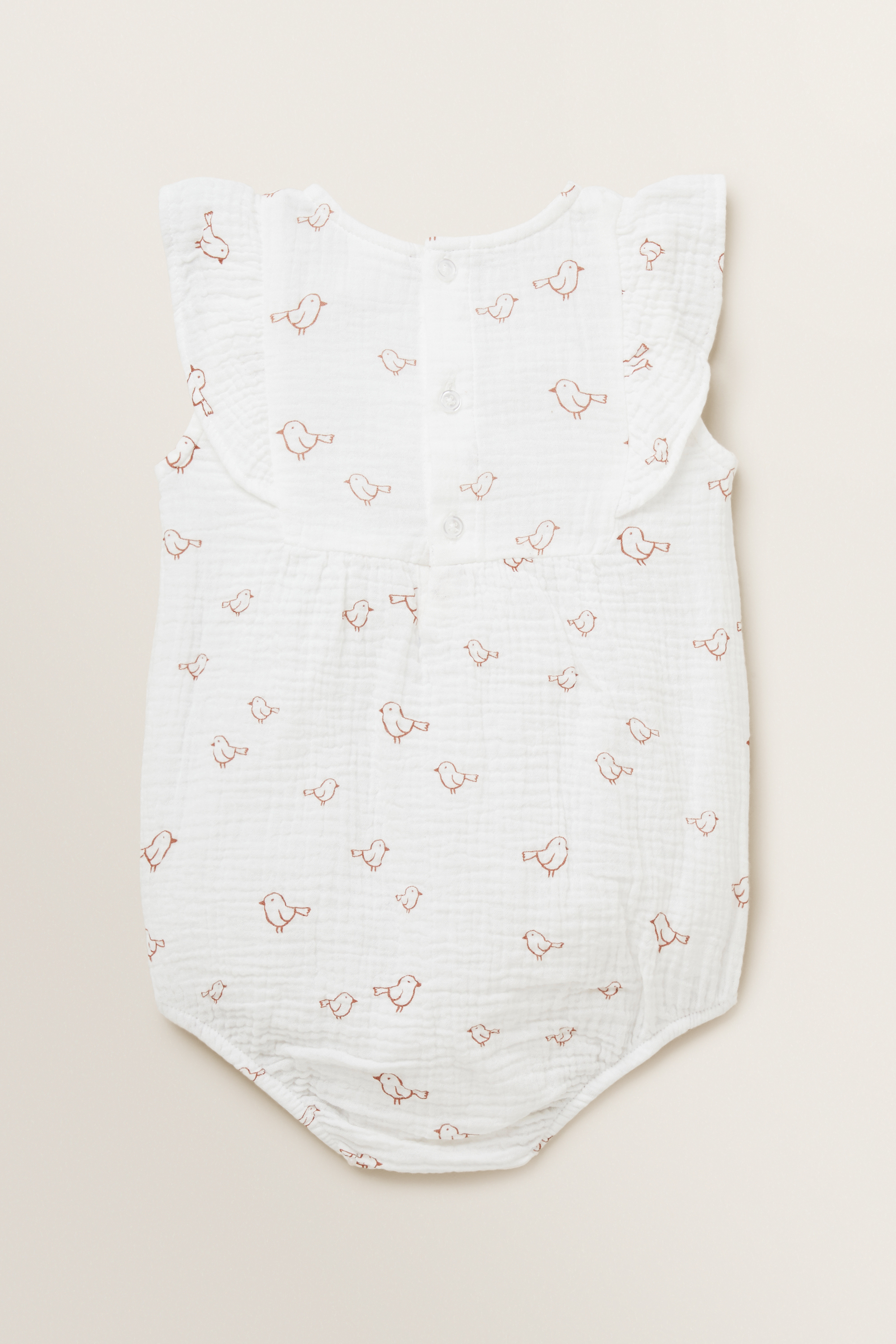 Made from a 100% cotton fabric, this Sparrow Onesie features a round neckline, frill shoulder straps, button back closure and cuffed bloomer shorts.