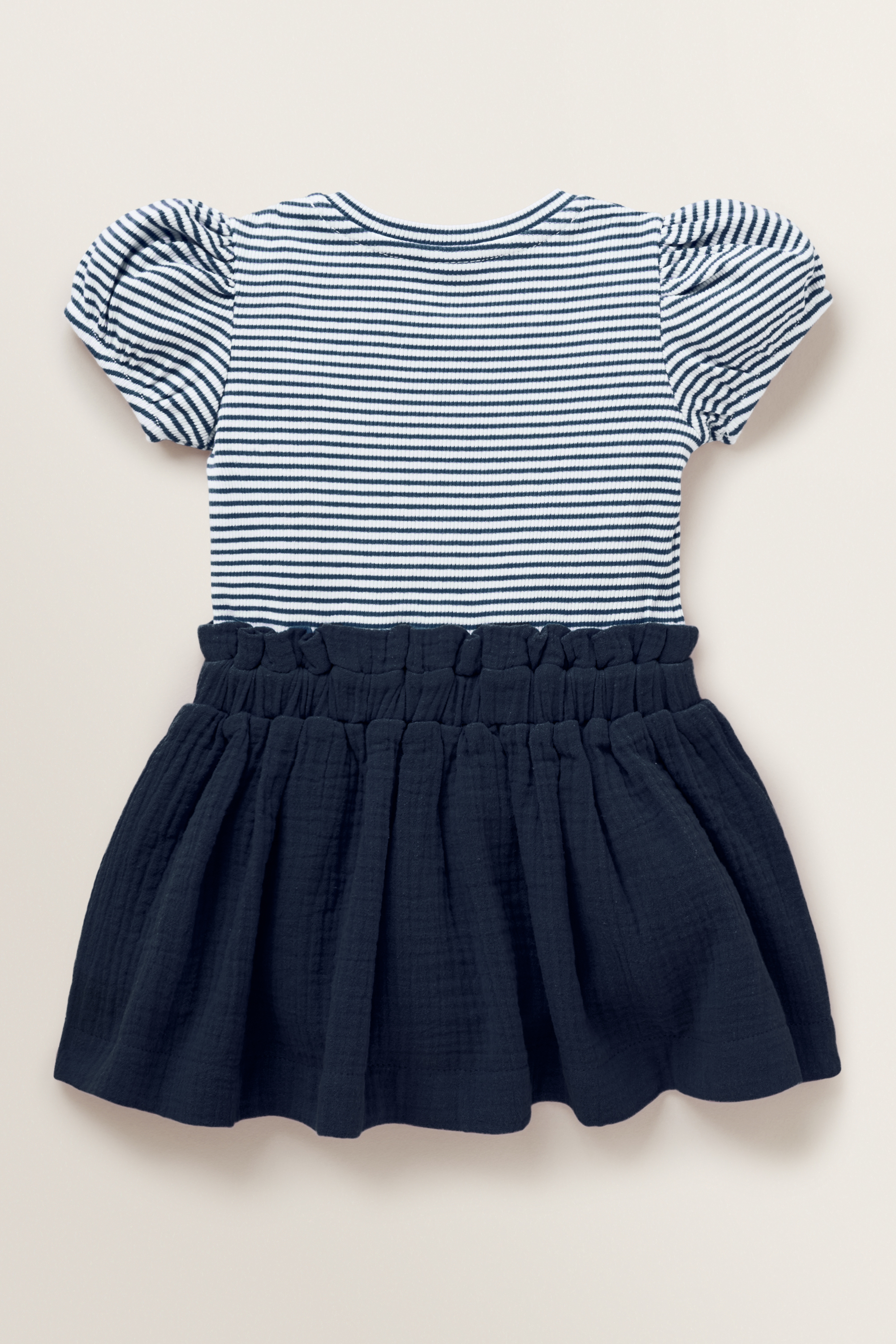 Detailed with a 100% cotton cheesecloth tiered skirt, this Splice Stripe Dress features a contrasting striped yardage tee, fitted with a round neckline, short puff sleeves and neat silhouette.
