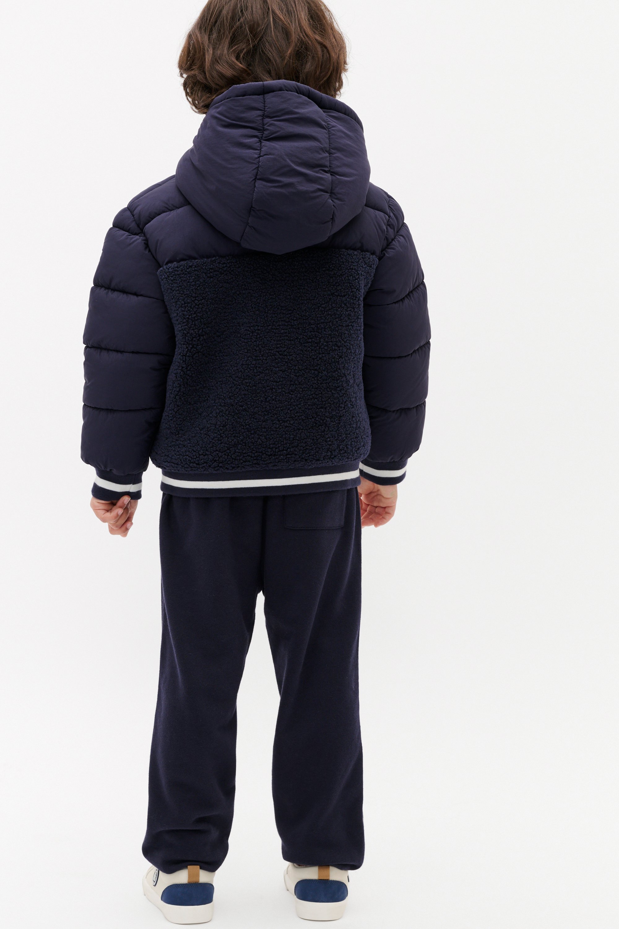 His wintertime go-to, this jacket is ready to be worn on repeat. It's a puffer style with a spliced design featuring an ultra-soft teddy finish and is fully lined for a comfortable fit. It has a hood, a zip-up front, long sleeves and angled pockets. For a cool and sporty look, it's finished with stripe details on the trims.