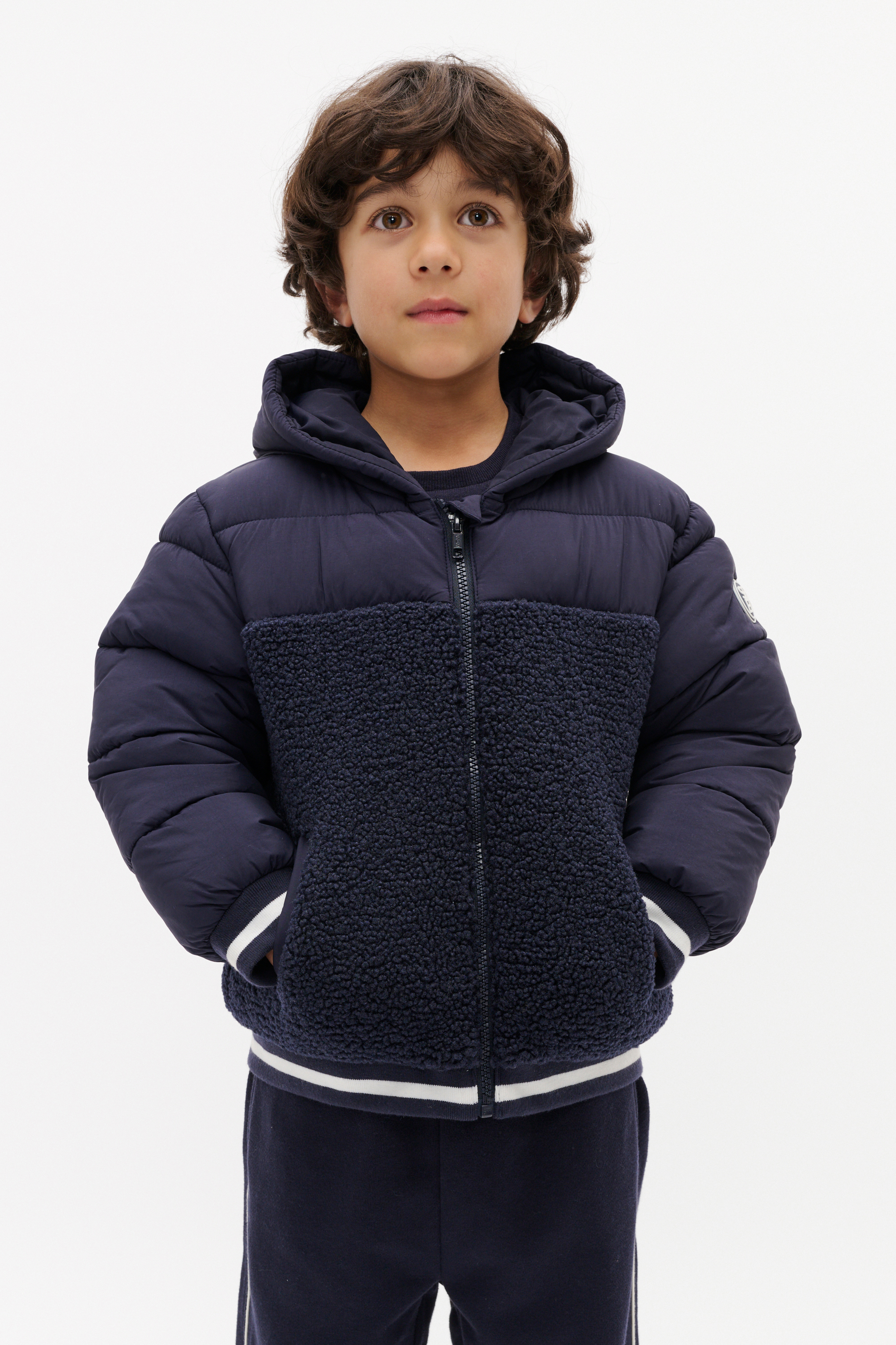 His wintertime go-to, this jacket is ready to be worn on repeat. It's a puffer style with a spliced design featuring an ultra-soft teddy finish and is fully lined for a comfortable fit. It has a hood, a zip-up front, long sleeves and angled pockets. For a cool and sporty look, it's finished with stripe details on the trims.