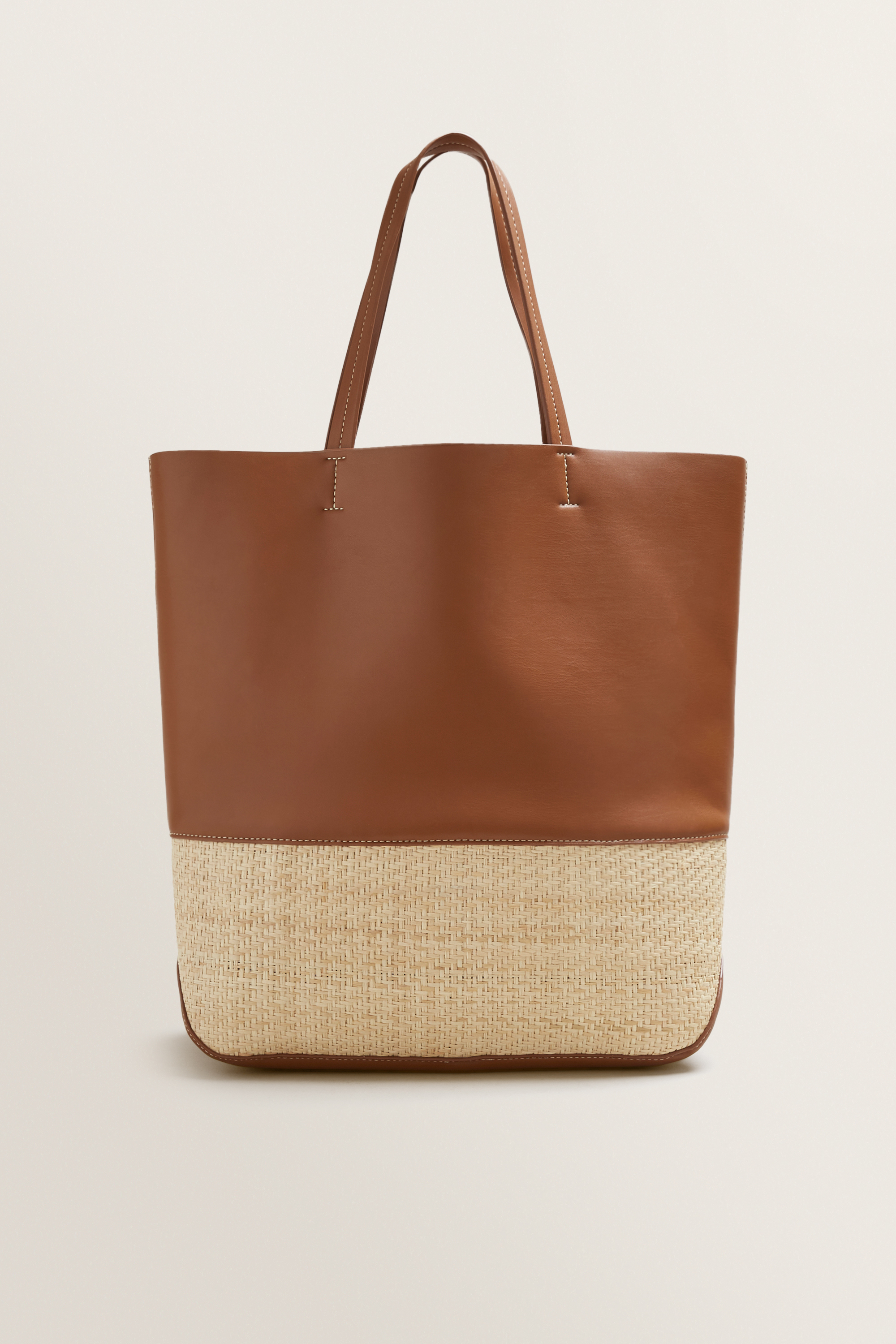 Designed with a contrasting leather-look fabric, this Spliced Tote features woven straw detailing, long shoulder straps, unlined interior and secure clip closure.