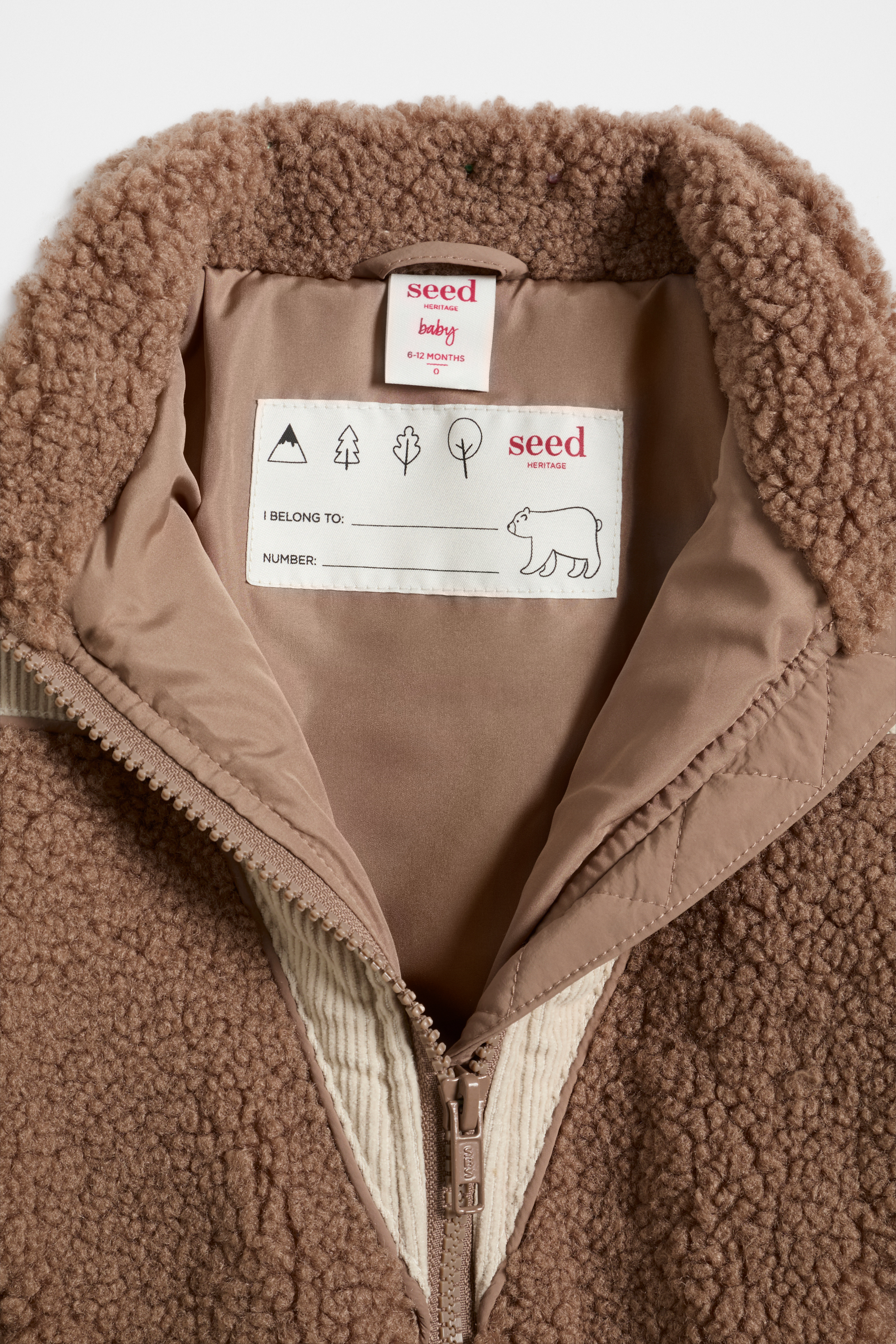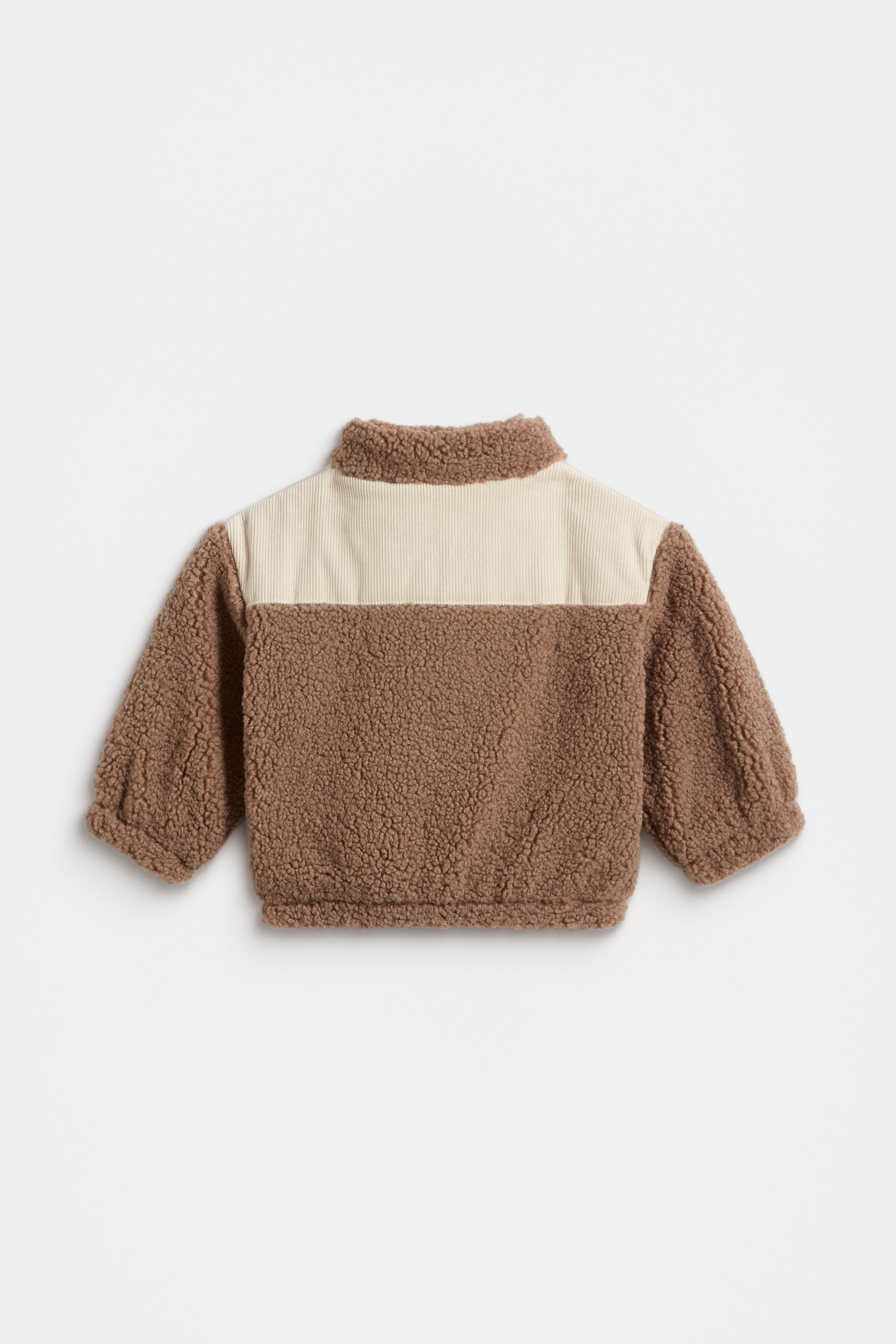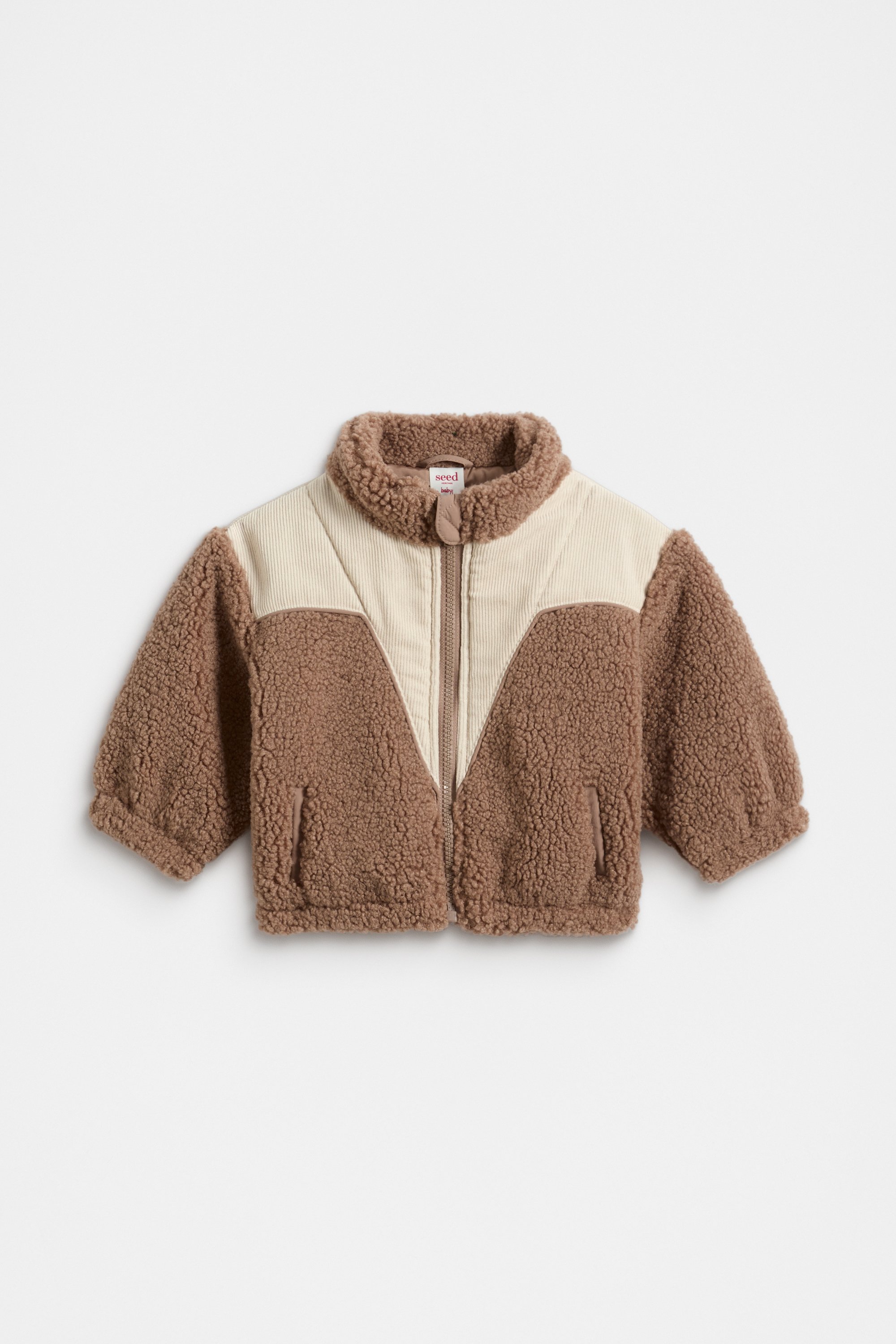The perfect little cosy layer, this jacket has a spliced design with a super-soft teddy finish. It features a high collar with a zip front, long sleeves and little pockets for little hands.