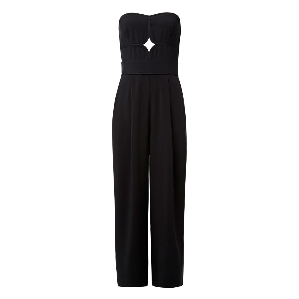 Polyester/Elastane Strapless Flare Jumpsuit. Strapless jumpsuit features a fitted cut out bodice with sweet heart neckline, fixed waist with cropped flare hem and side pockets. Available in Black as shown.