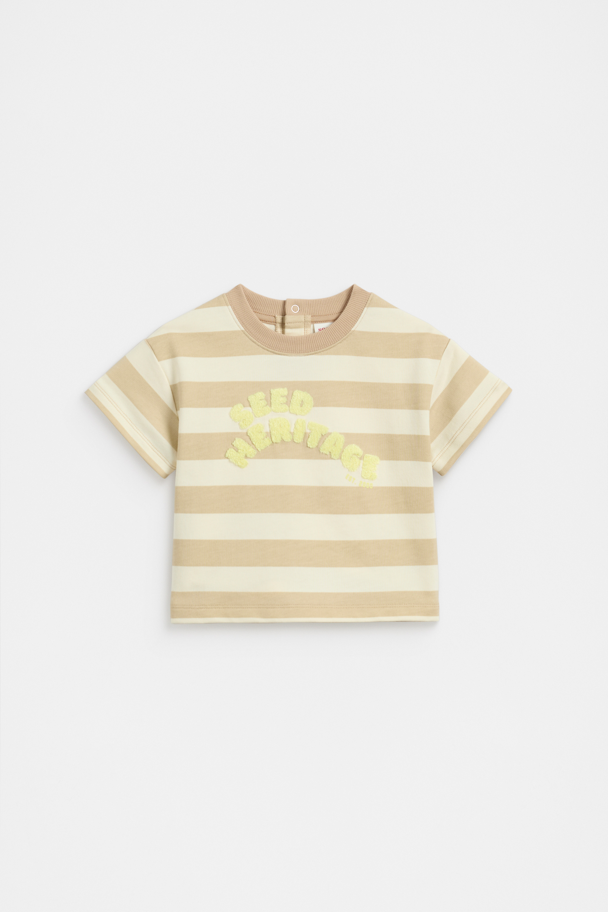 So cute and comfy, this little tee is ready to wear on repeat. Crafted in premium cotton with a little stretch at the neckline, it features a stripe pattern, a chenille patch design, short sleeves and snaps at the back of the neck for easy changes.