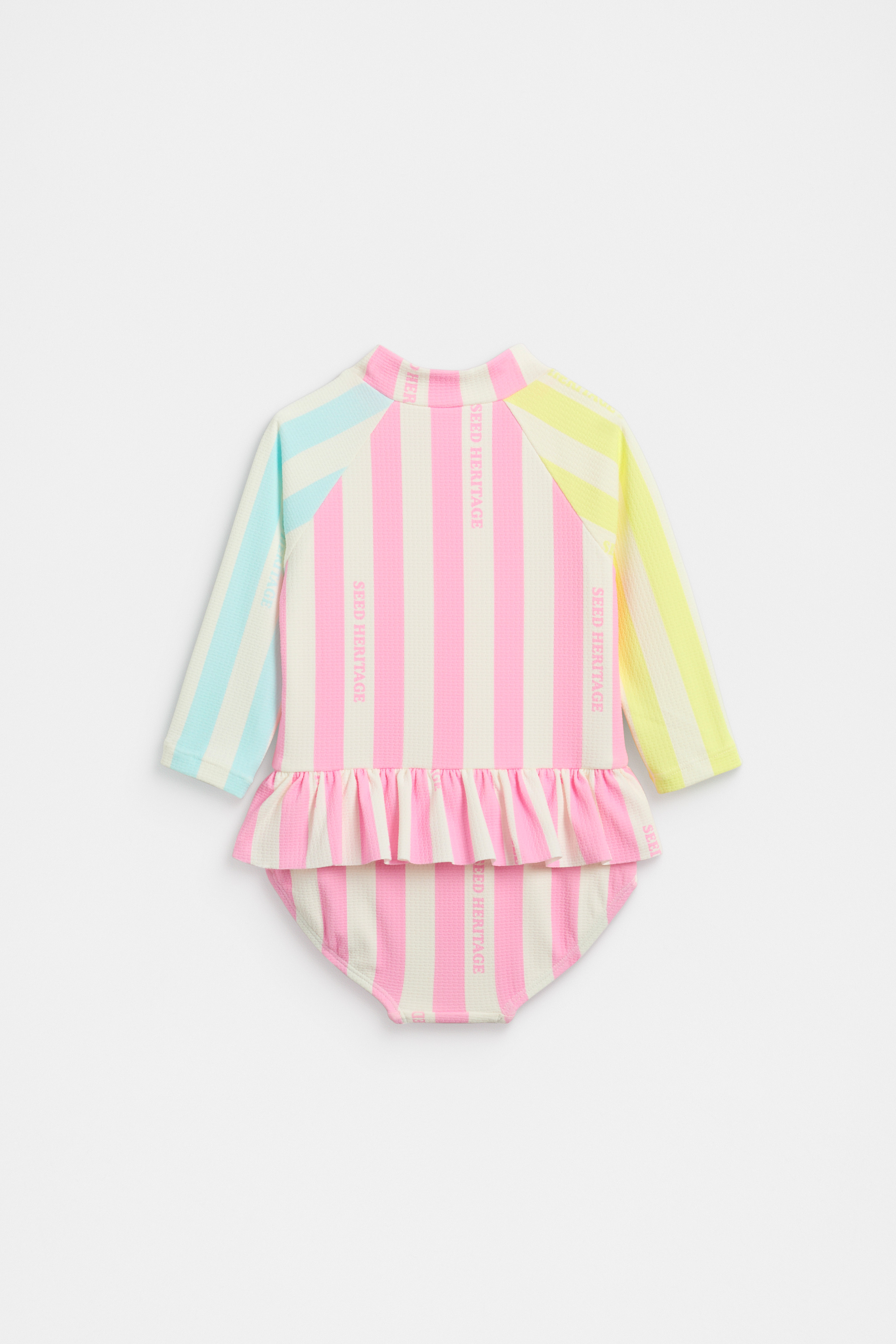 Ready for a summer in the pool, this swimsuit features a brightly coloured stripe design. It features a round neck, long raglan sleeves, a zip front and the cutest ruffle trim detail.
