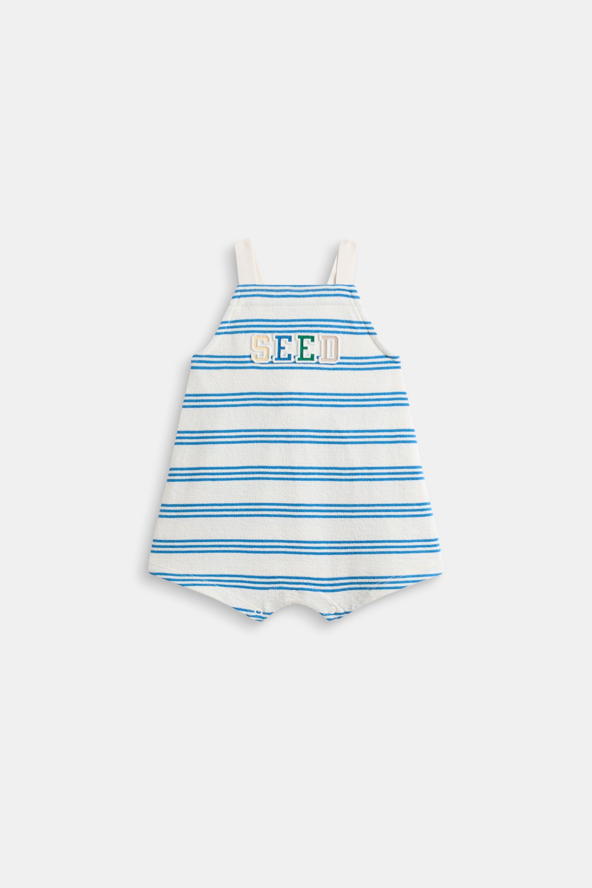 This little romper guarantees head-to-toe cuteness. Crafted in a textured cotton blend, it features adjustable straps that secure with a button at the back, a stripe pattern, an embroidered Seed Heritage logo and snaps at the gusset for easy changes.