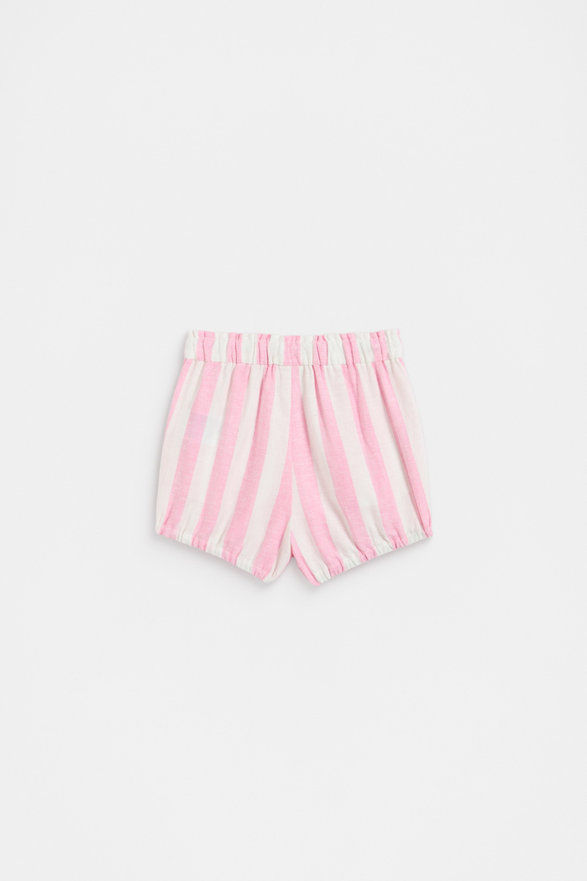These stripey bloomers are a handy pair for everyday cuteness. Crafted in a lightweight blend containing linen, they feature an elasticated waistband, pockets with a scallop trim and elasticated leg openings for comfort and ease. Pair with the matching top for the most adorable head-to-toe set.