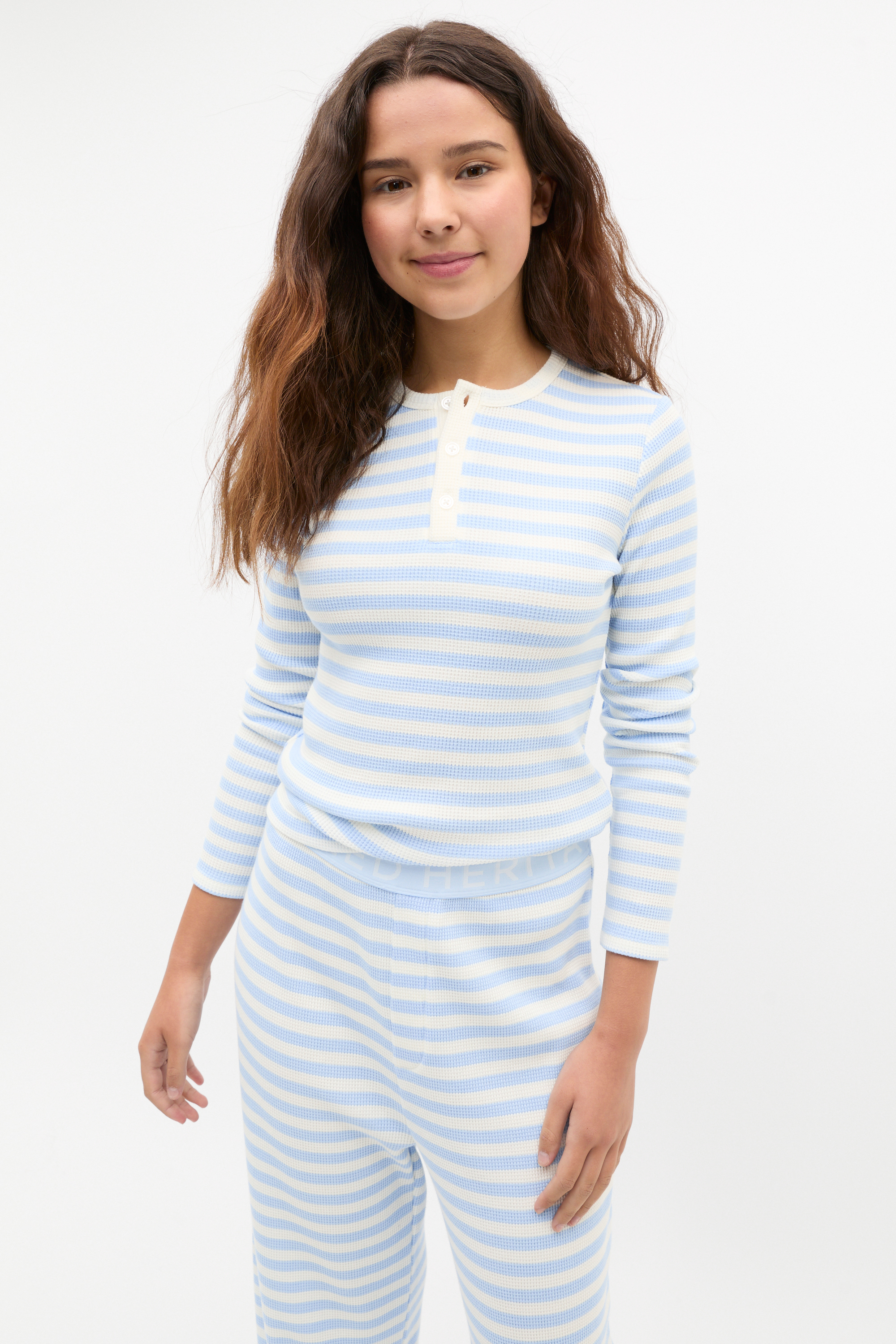 Comfortable in cotton, these pyjamas offer an easy night's sleep. They feature a long sleeve top with a round neck and a button detail and long pants with an elasticated logo waistband. Finished with a waffle texture in a timeless stripe, they're ready to dream the night away.