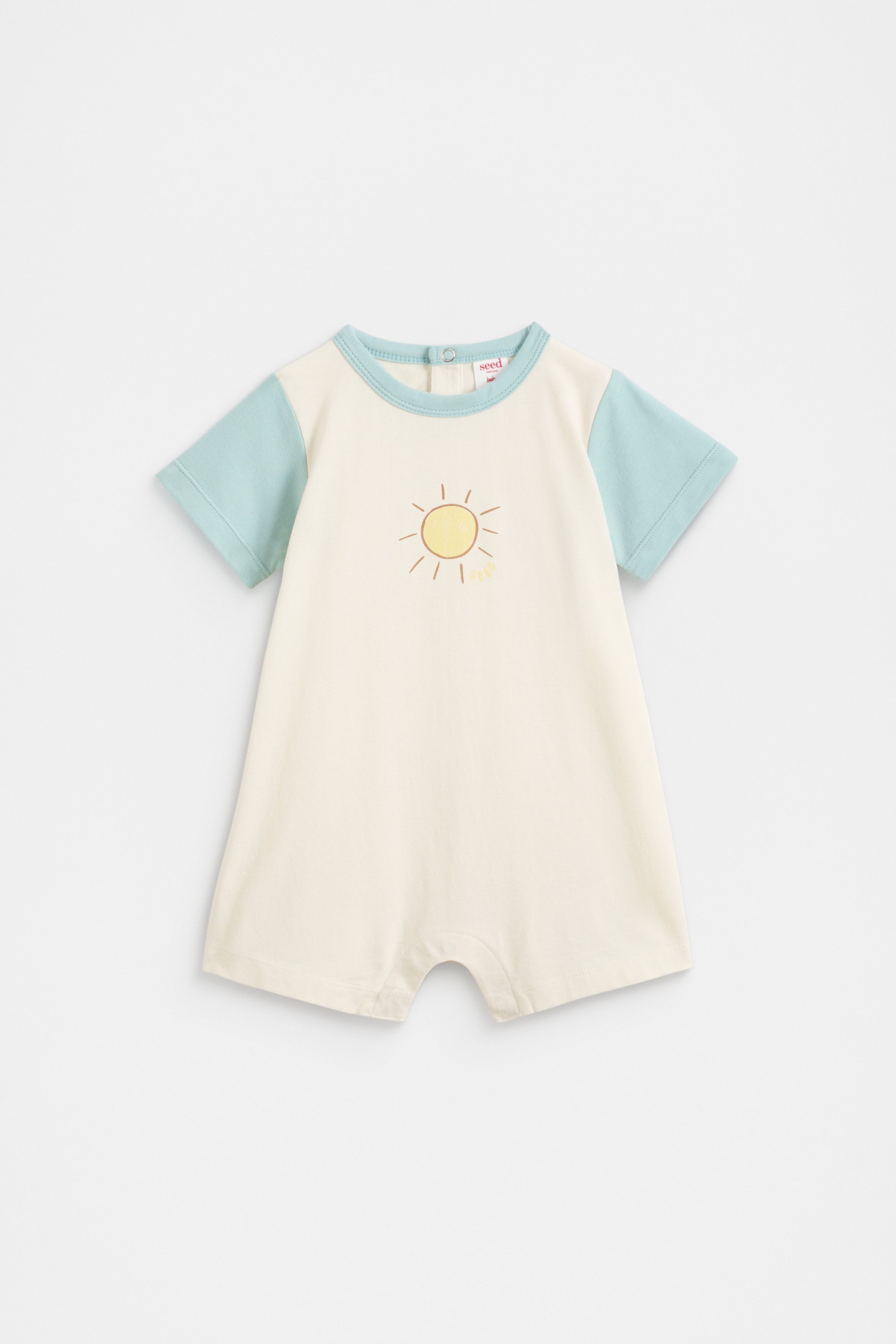 Comfortable and cheerful, this romper brightens up their little wardrobe. Crafted in premium cotton, it features a round neck, short sleeves, and for easy changes it has snaps at the back of the neck and snaps at the gusset. Pair with the matching sunny styles for the sweetest set, perfect for gifting.