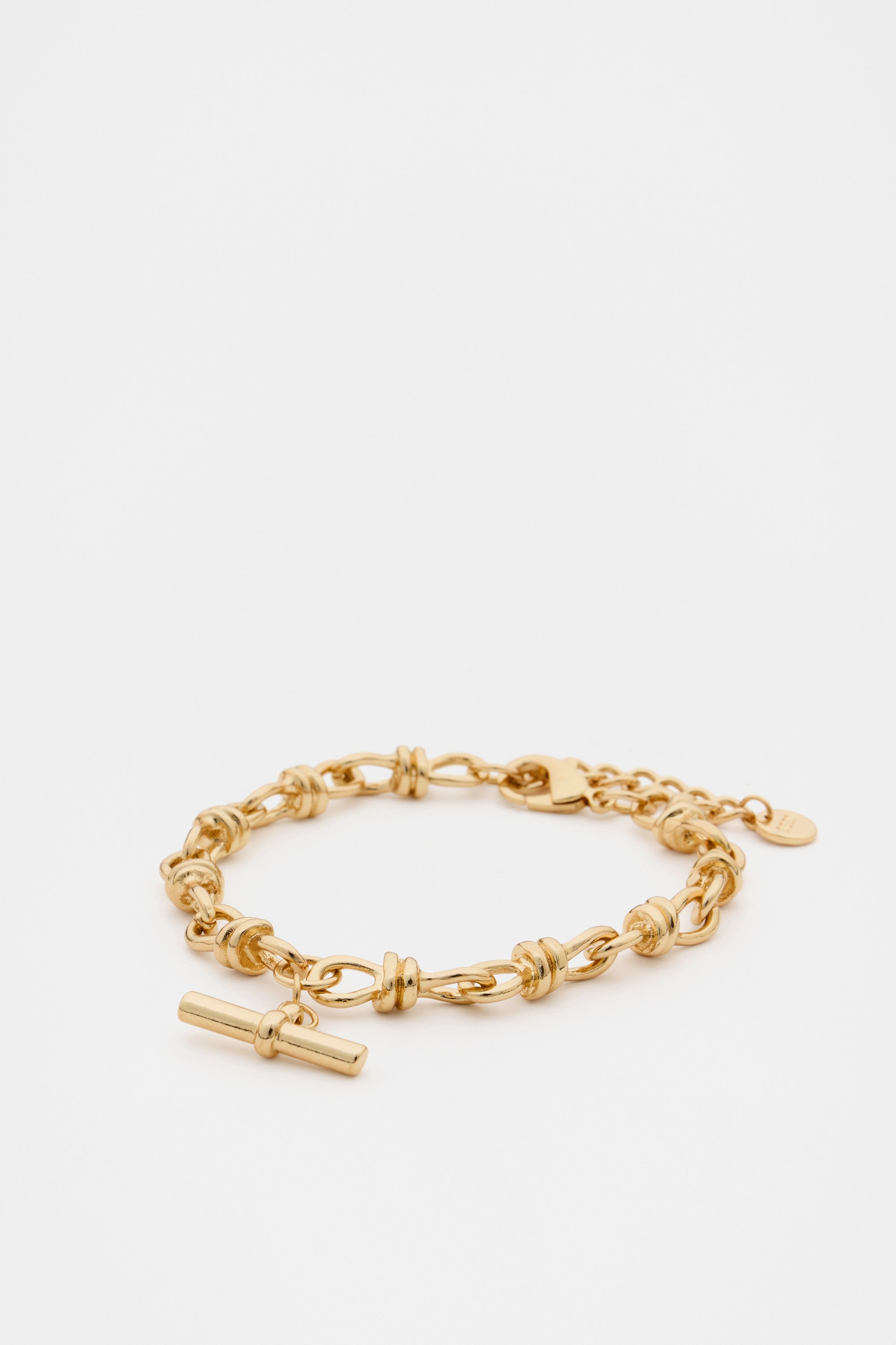 A chic finishing touch, this bracelet is an elevated option for your new-season outfitting. With a high shine gold plating, it features a classic T-bar pendant on an ornate chain. Style with the coordinating necklace for a curated feel.