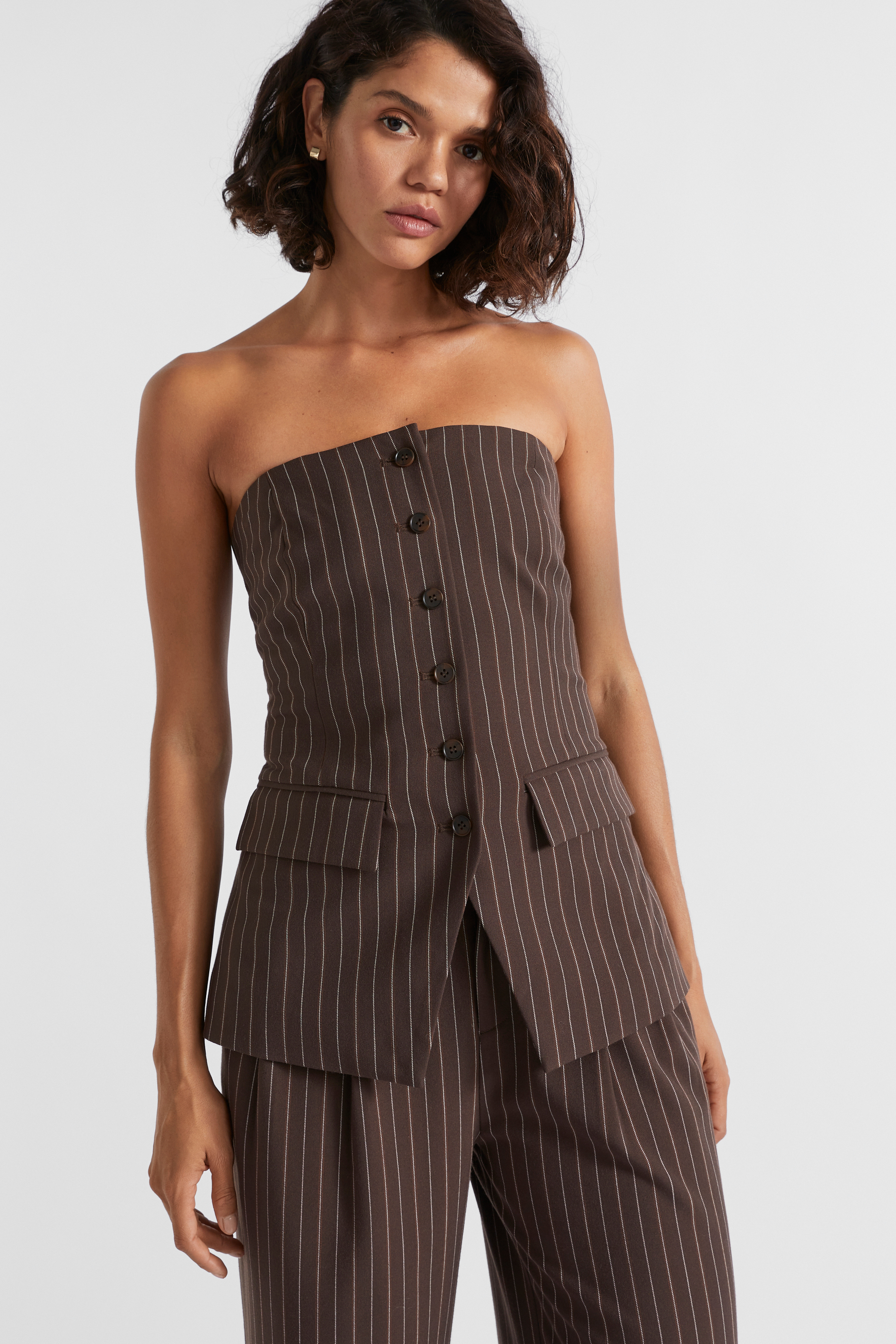 Structured and on trend, this bodice features a strapless construction, a button front, and front pockets, all in a longline cut with a subtle fit-and-flare shape. It can be styled back with the matching pants and blazer for a modern suiting look.