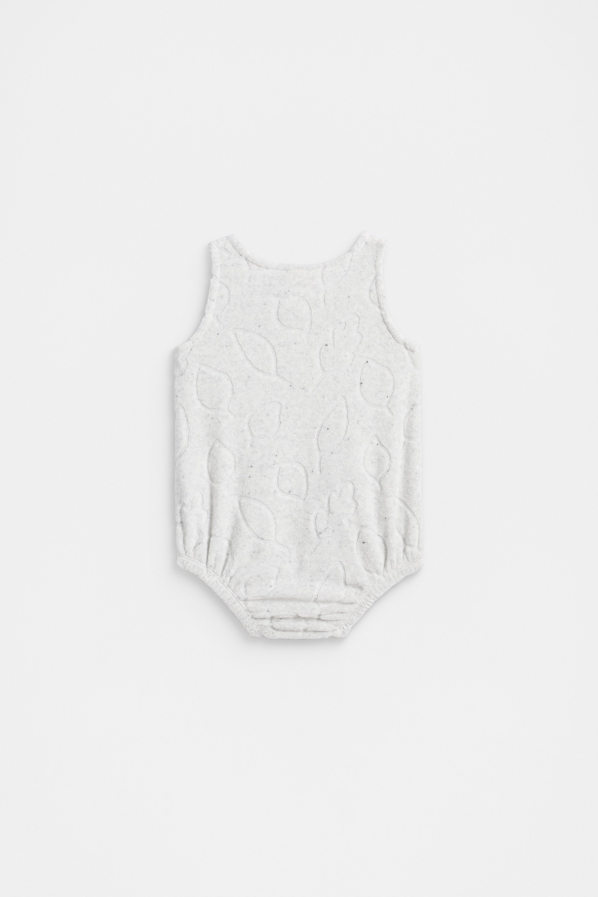 An adorable option for your little one, this romper is a summer must-have. It's a sleeveless style with a round neck and a button front detail, elasticated leg openings and gusset snaps. Crafted in a terry towelling cotton blend, it features an all-over textured leaf print.