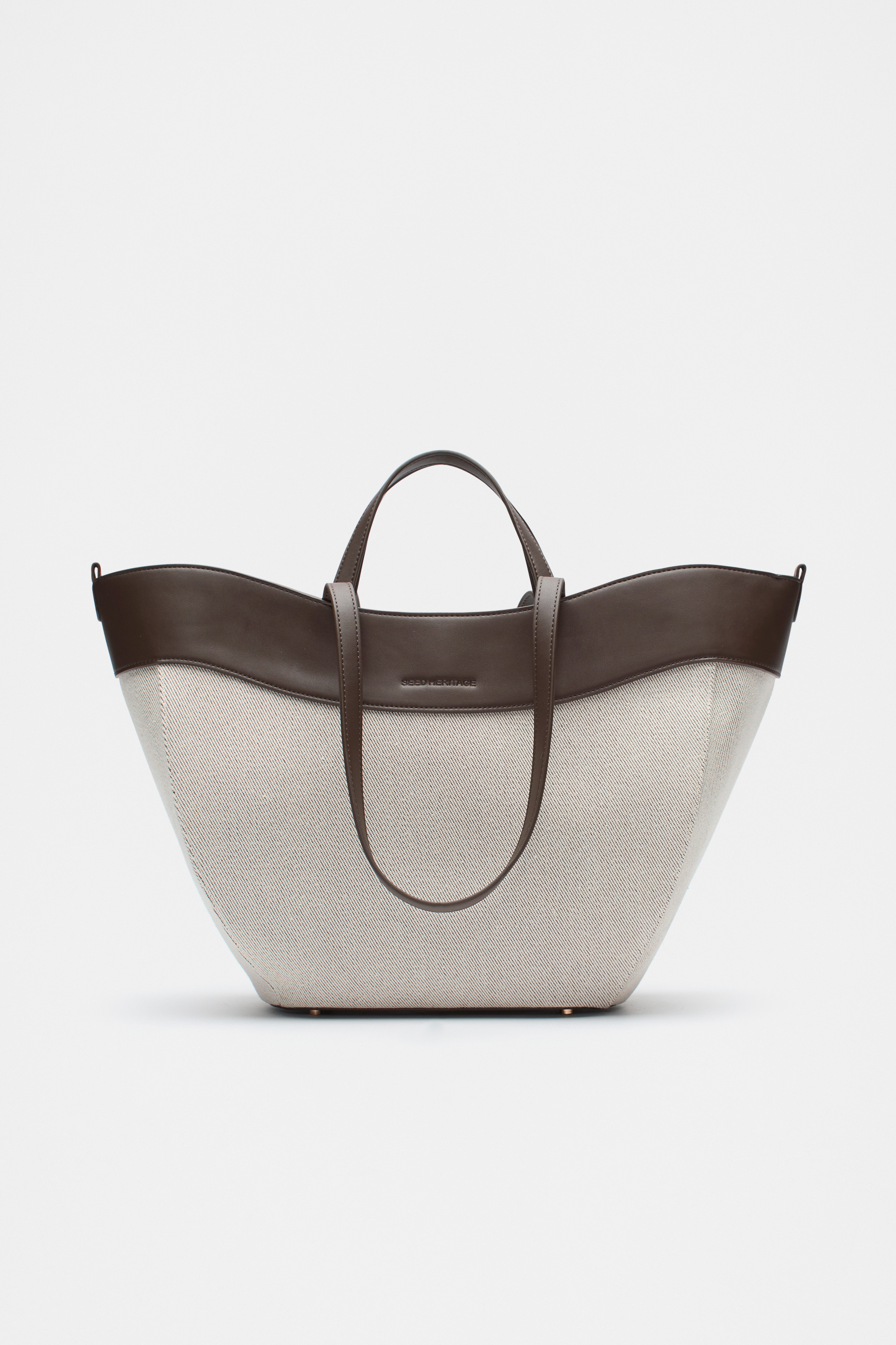 This curved tote bag adds texture and elegance to your every day. It has a soft fabric finish and features short carry handles, shoulder straps and secures at the topline with a dog clip closure.