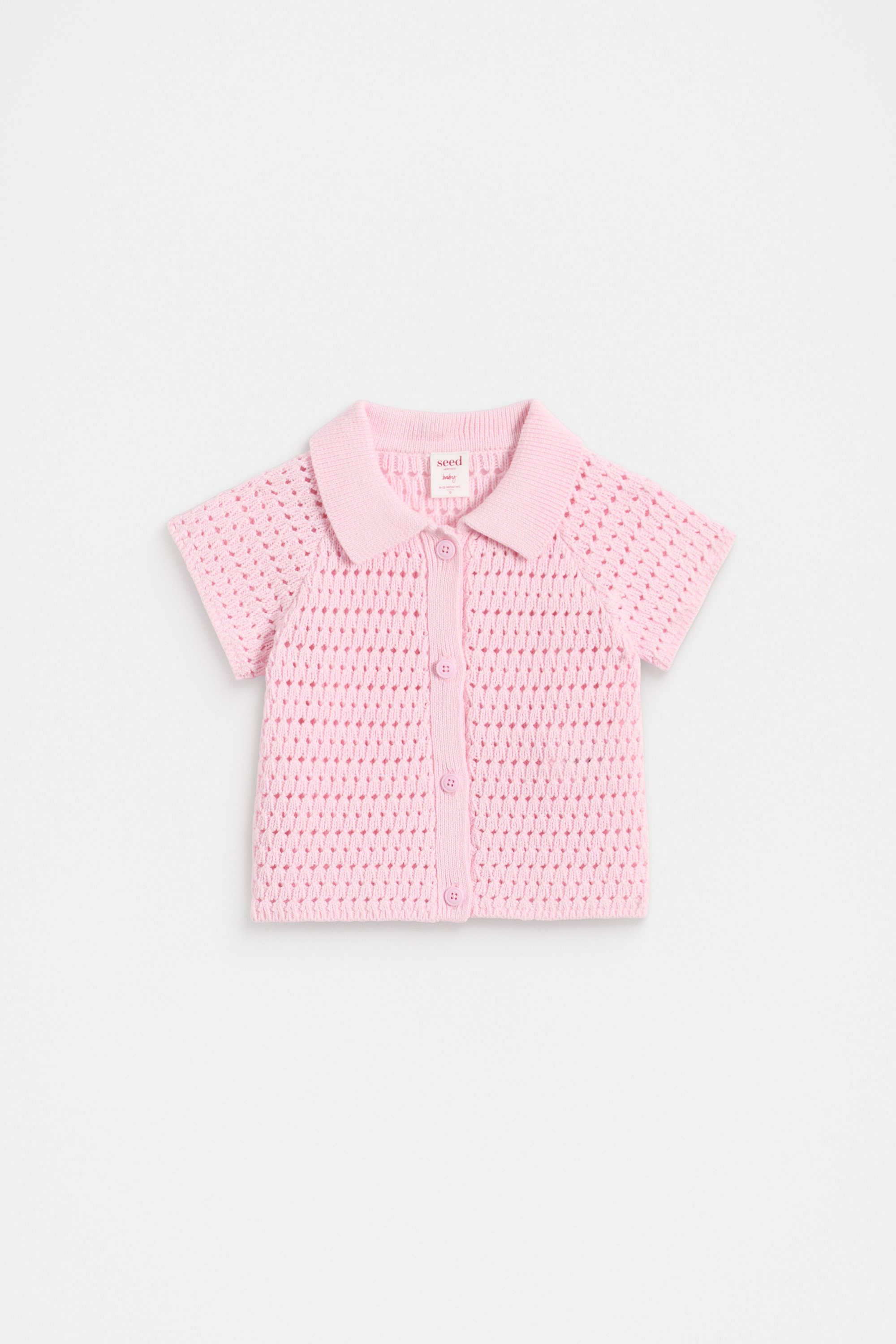 In a sweet textured knit, this shirt features a collar, a button front, short sleeves, and ribbed trims. It's crafted from cotton, and can be paired with the matching knit shorts for an adorable set.