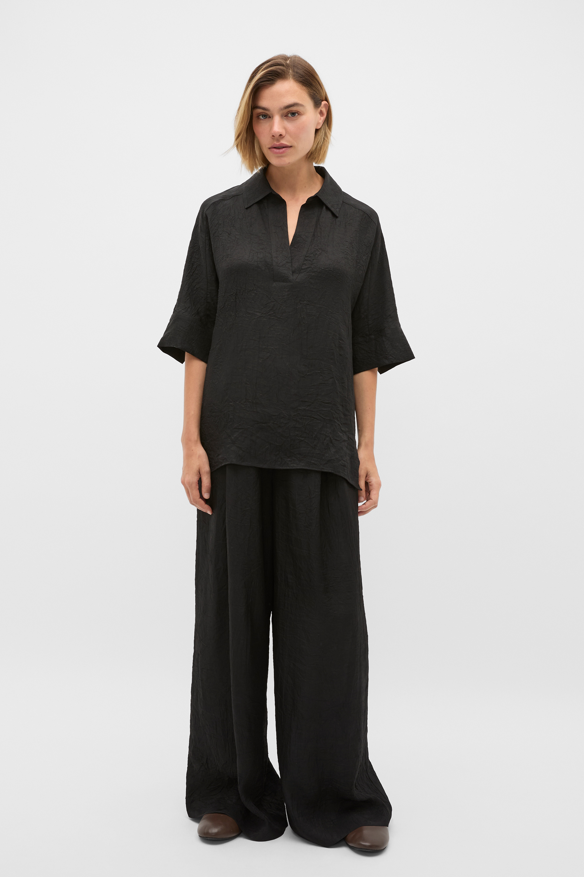 Textured Satin Collared Popover  Black  hi-res