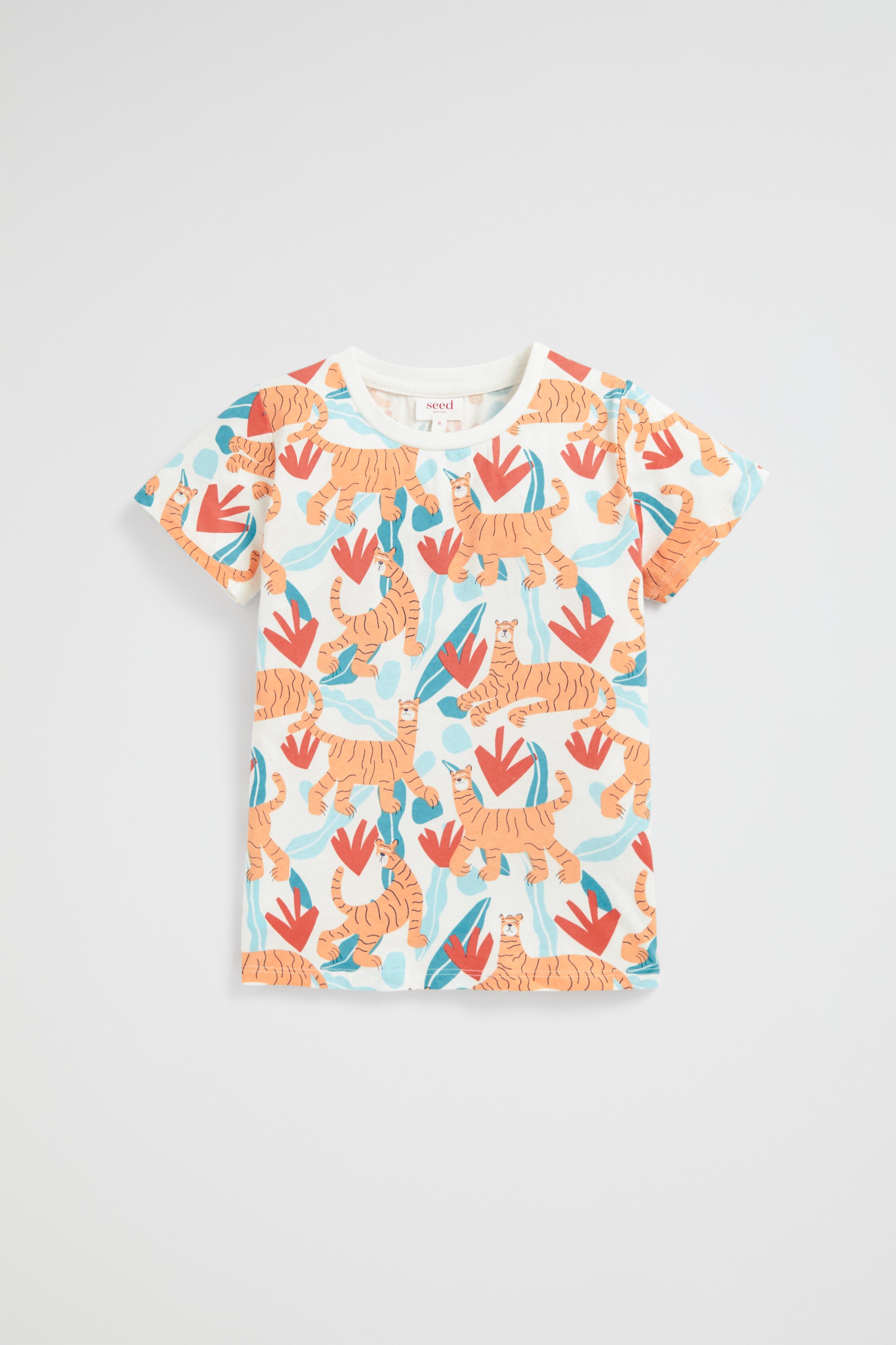 This fun tee has a crew neckline, short sleeves and a comfortable fit. A bold all-over tiger print makes this tee stand out. Made from 100% cotton.