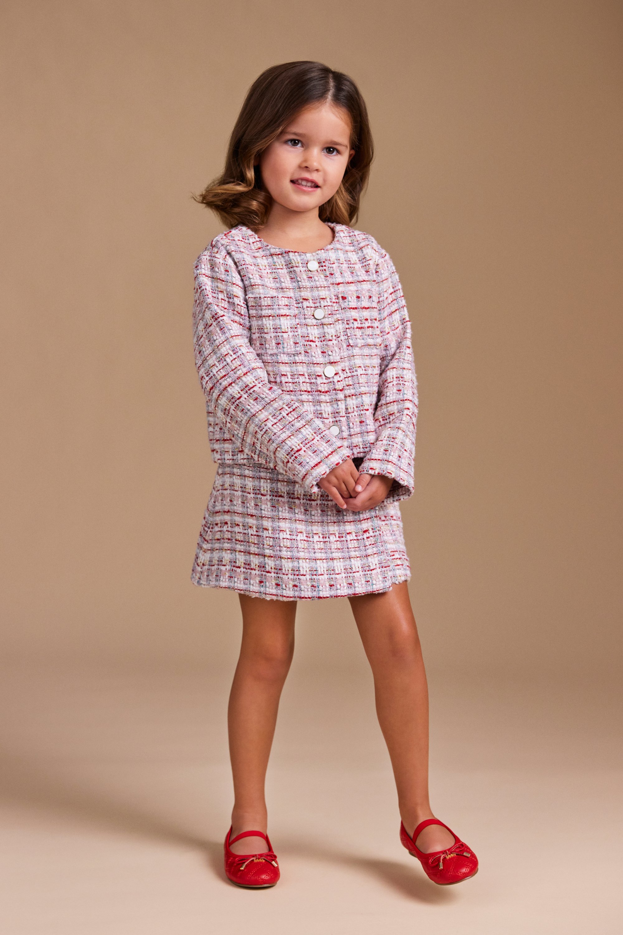 Finish her outfit with this sweet tweed skirt, textured to add interest to her head-to-toe. Perfect for special occasions and family events, it features a fixed waistband with a wraparound front and a button detail. Style with the matching tweed jacket and accessories to have her twirling in her party-ready best.