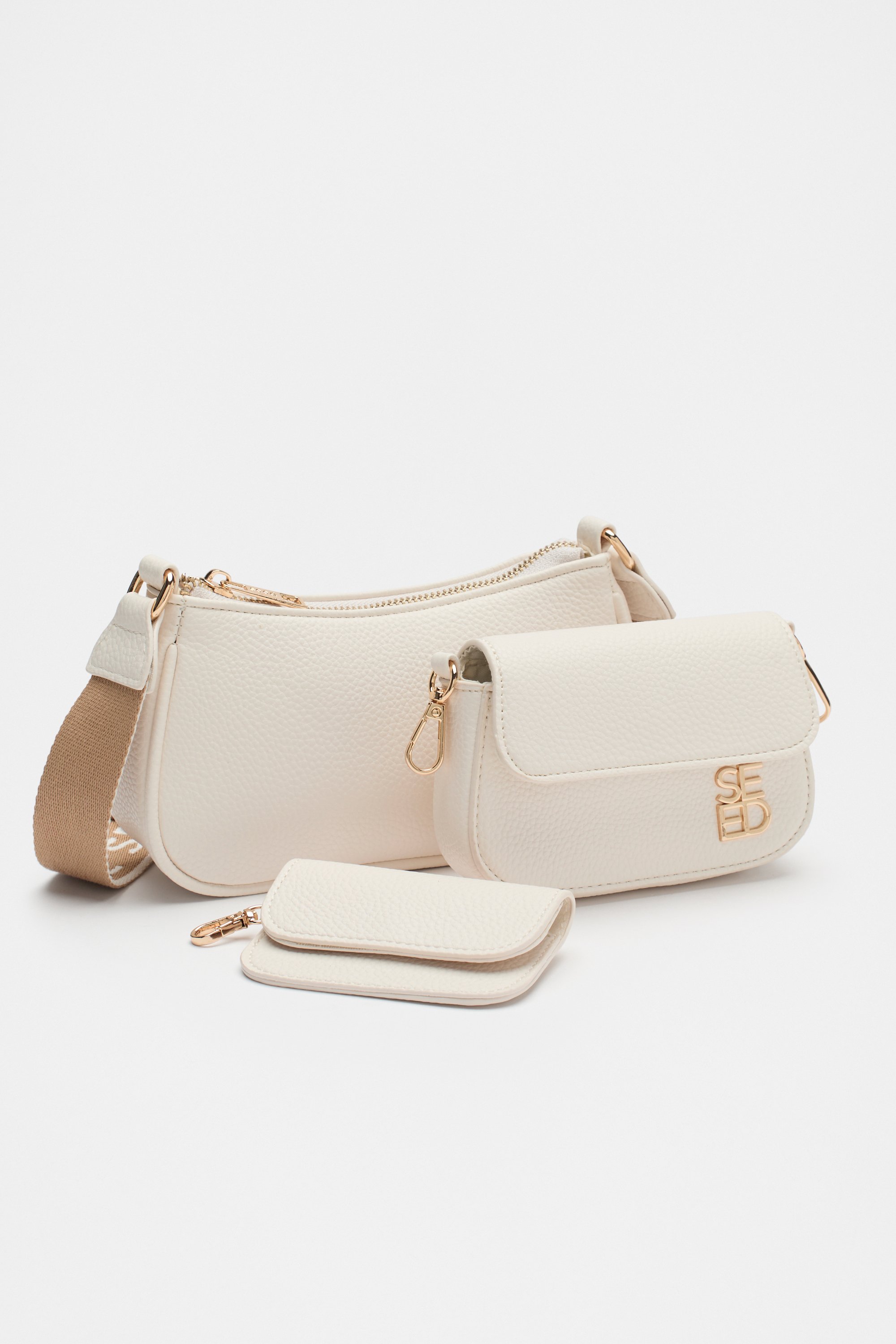 A sophisticated and chic option for her wardrobe, this bag is the most versatile style. With a detachable card pocket and a detachable miniature bag, she can customise this set to complement any look. It features gold tone hardware, parrot clasps and an adjustable Seed Heritage logo strap.