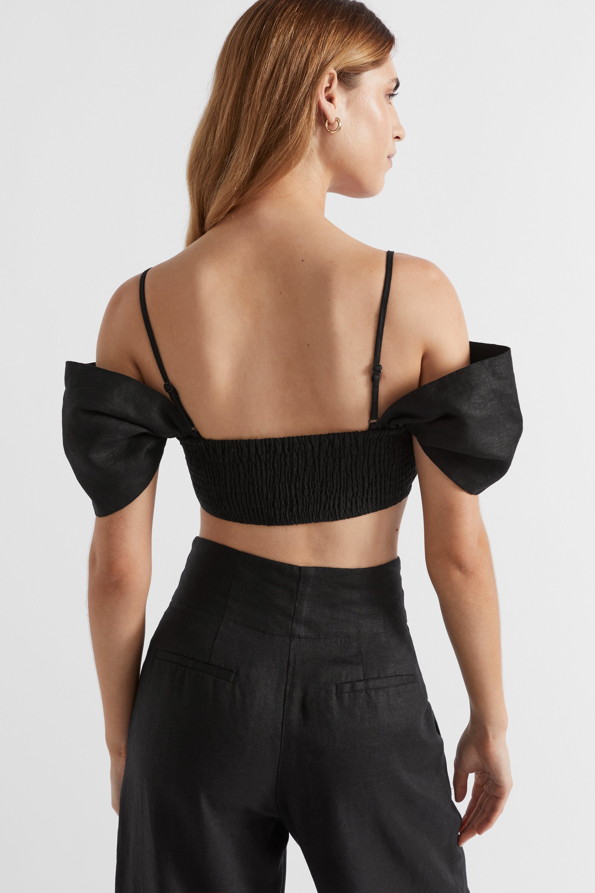 Crafted from premium linen, this crop is ideal for summer events and evenings out. It features slim straps and an off-the-shoulder neckline, with a twist front at the bust. Style with high-waist trousers.