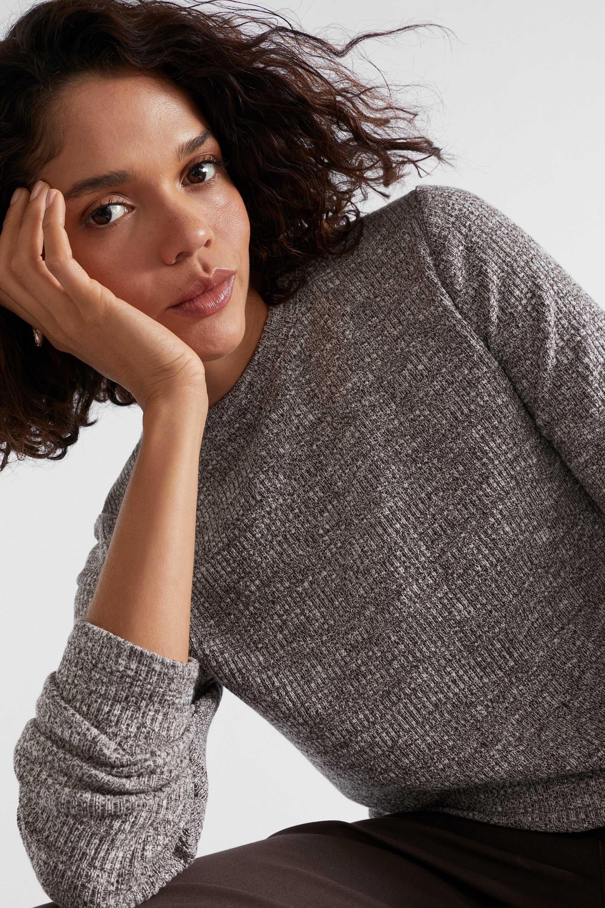 The perfect transeasonal layer, this top has a round neck, long sleeves, and a curved hem. Featuring a textured rib, it is crafted from a cotton stretch blend. By choosing our cotton products, you are supporting our investment in the Better Cotton mission.