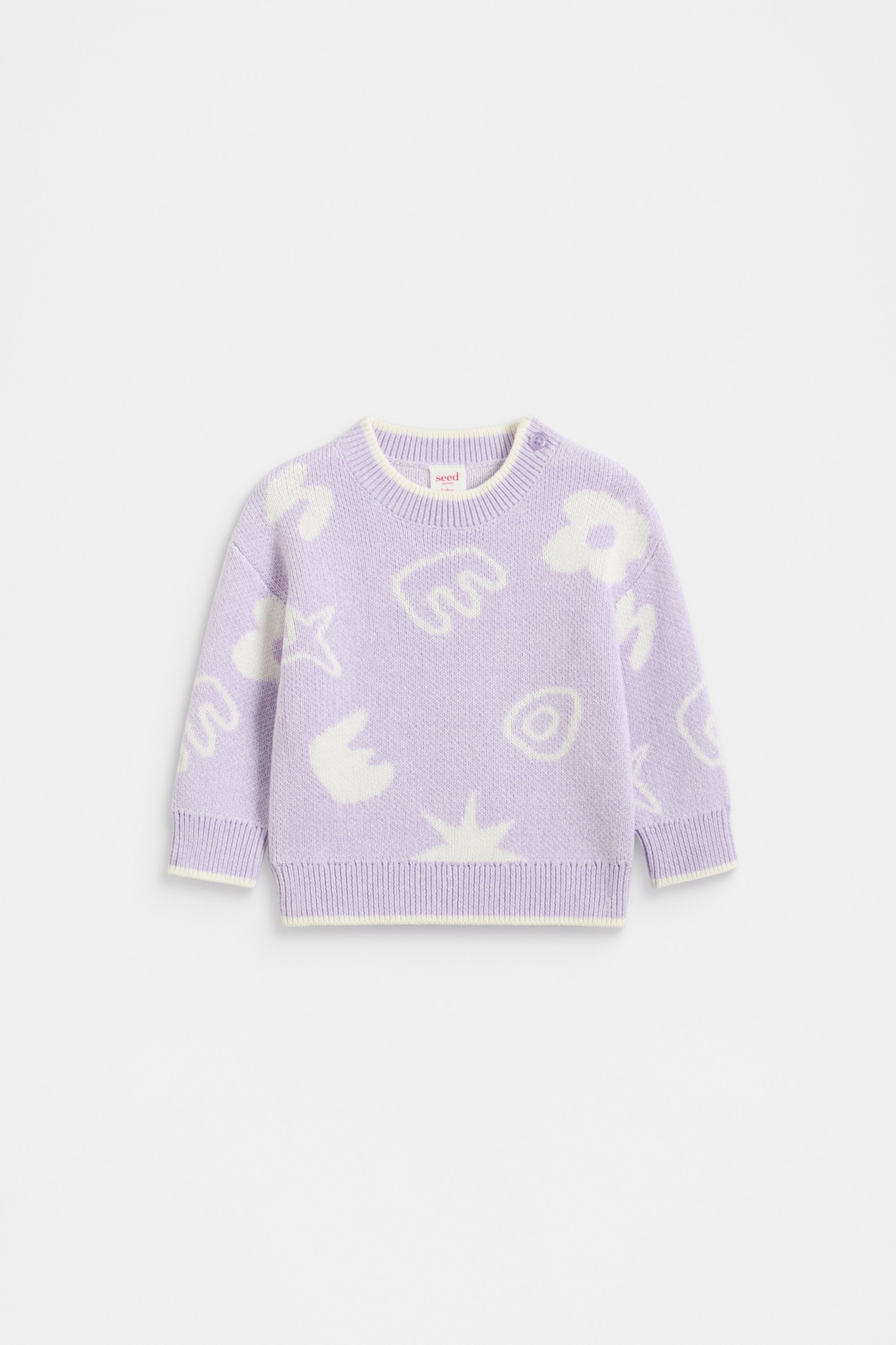 All lovely in lavender, this knit jumper is a soft and cosy style. Crafted in premium cotton, it features a round neck, long sleeves, shoulder buttons and a white trim at the collar, cuffs and trim.
