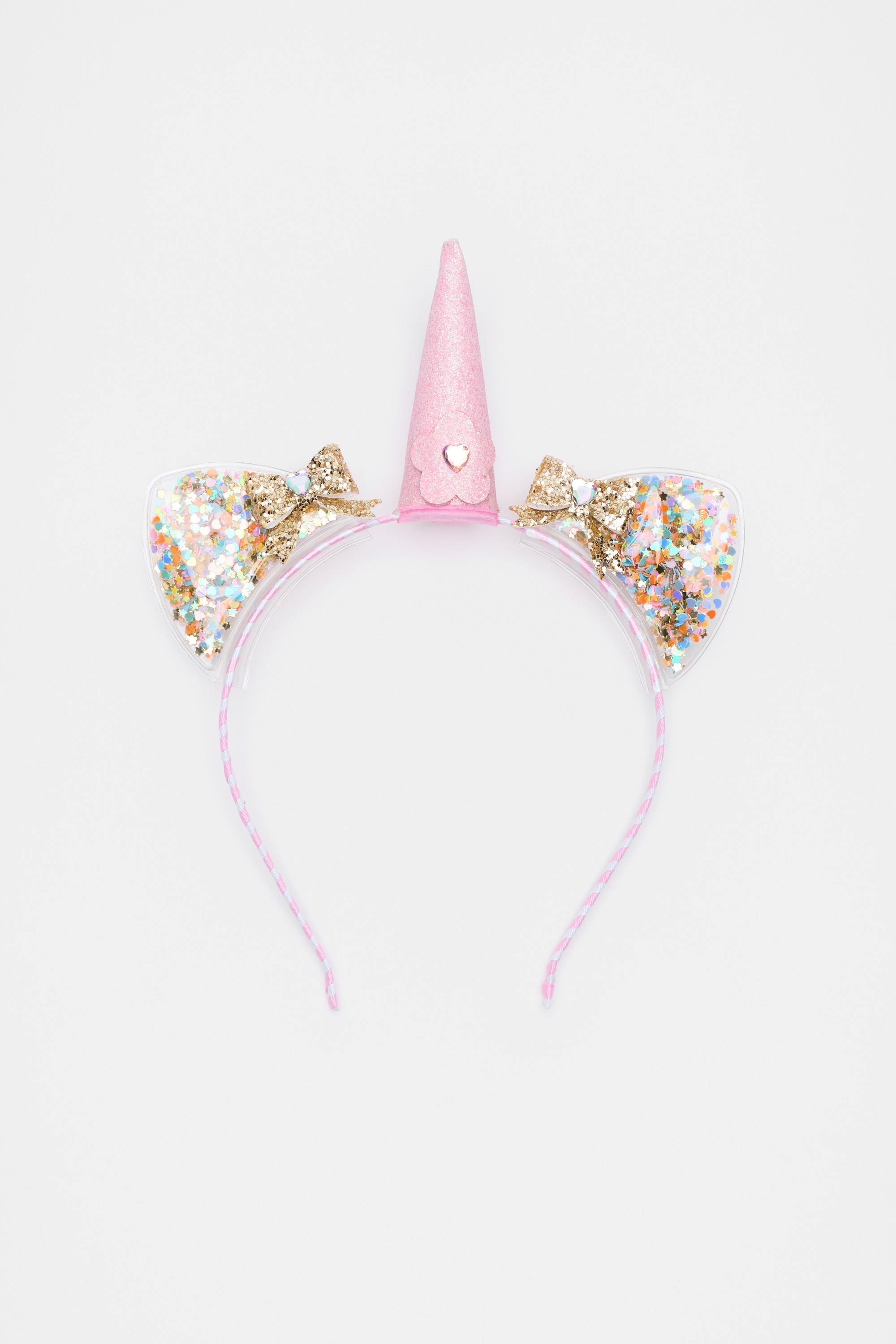 Perfect for her dress up box, this headband features unicorn ears and a unicorn horn, detailed with glitter and bows. This product is not a toy and is not suitable for children three years and under.