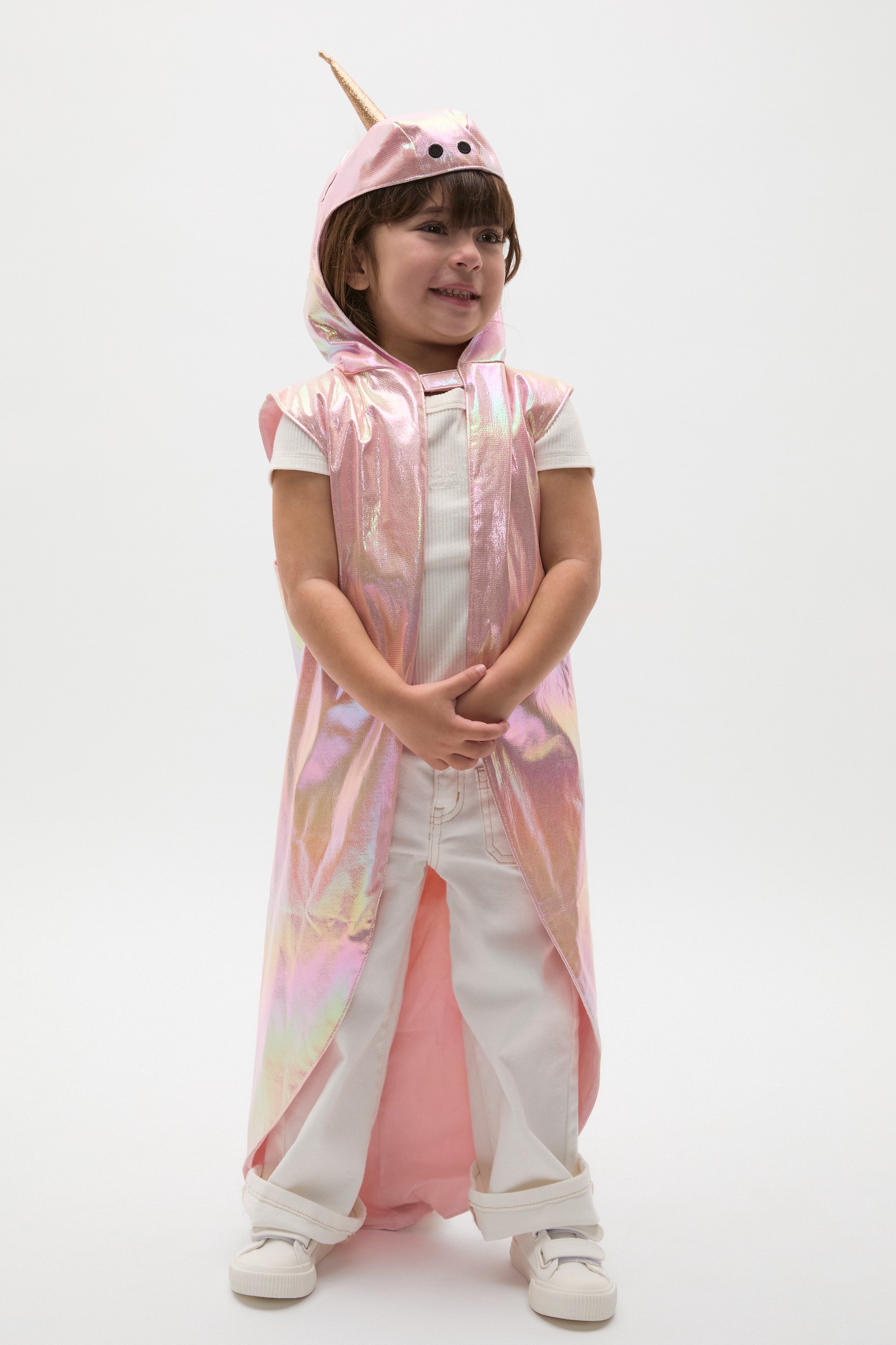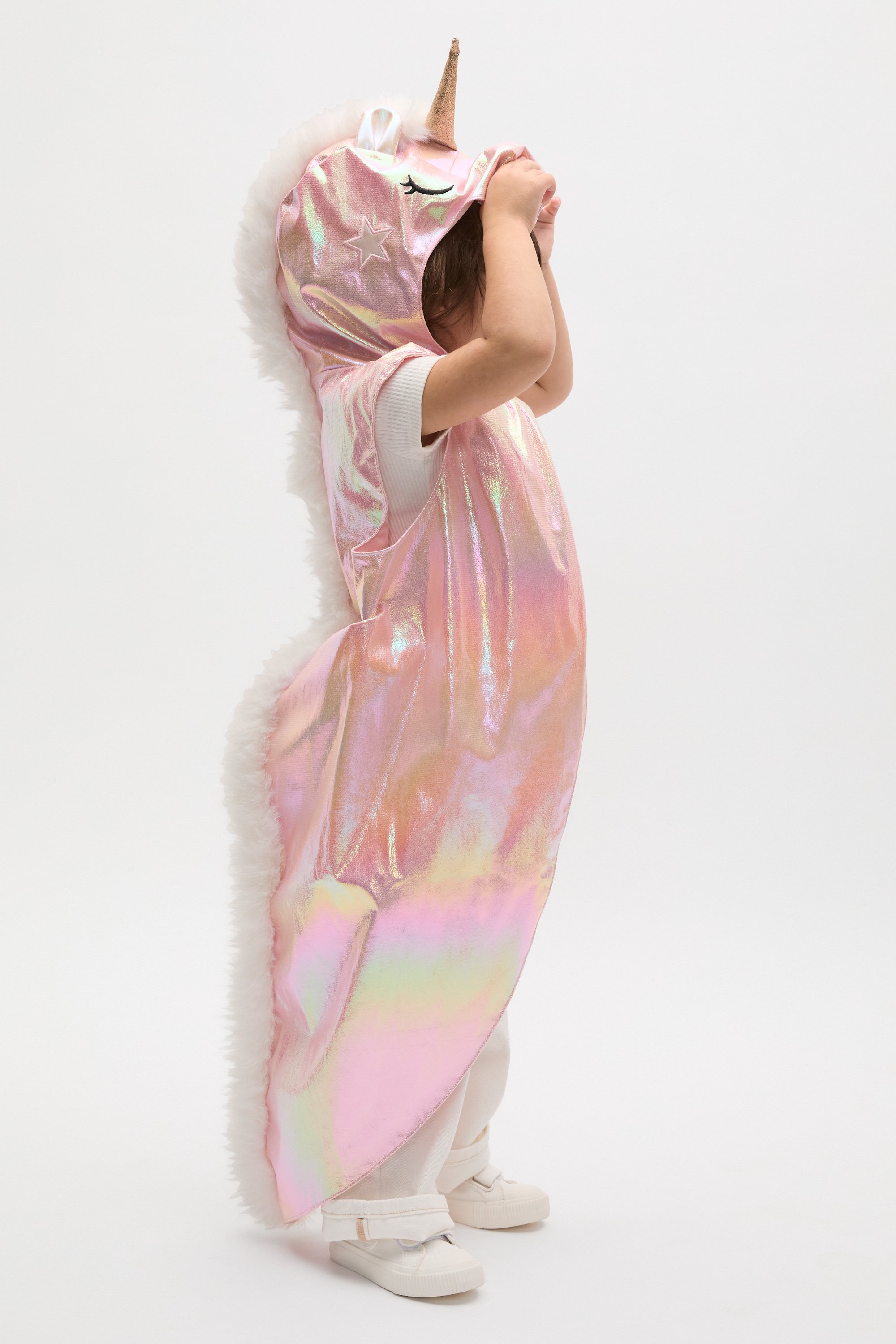 Magical and sweet, this unicorn costume brings her imagination to life. It features a hooded design with a unicorn horn on top and a mane that runs down the back. It secures across the front with a hook-and-loop tab. Not recommended for children three years and under