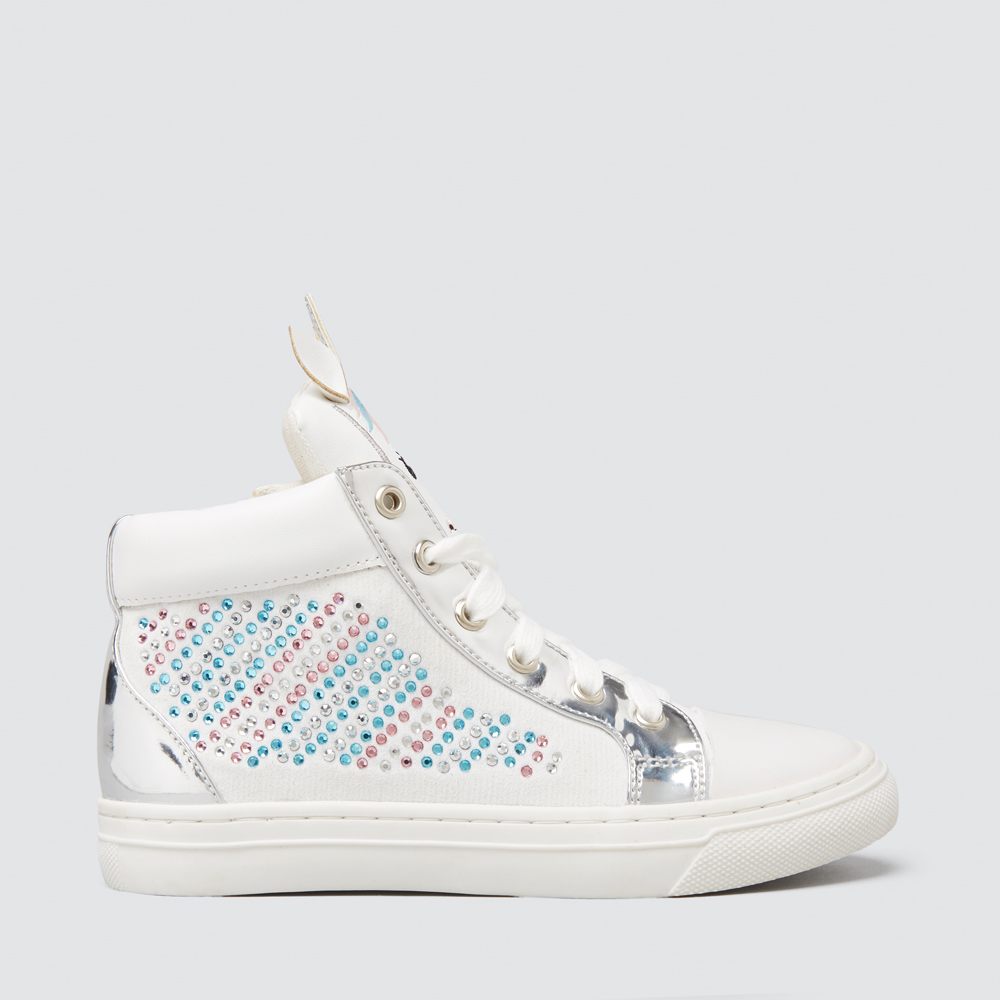 These high-top sneakers feature a unicorn flap on the front, sparkly jewel accents on the sides and internal zip closure. Made from a Synthetic upper and a rubber sole, these sneakers are available sizes 24 to 33.