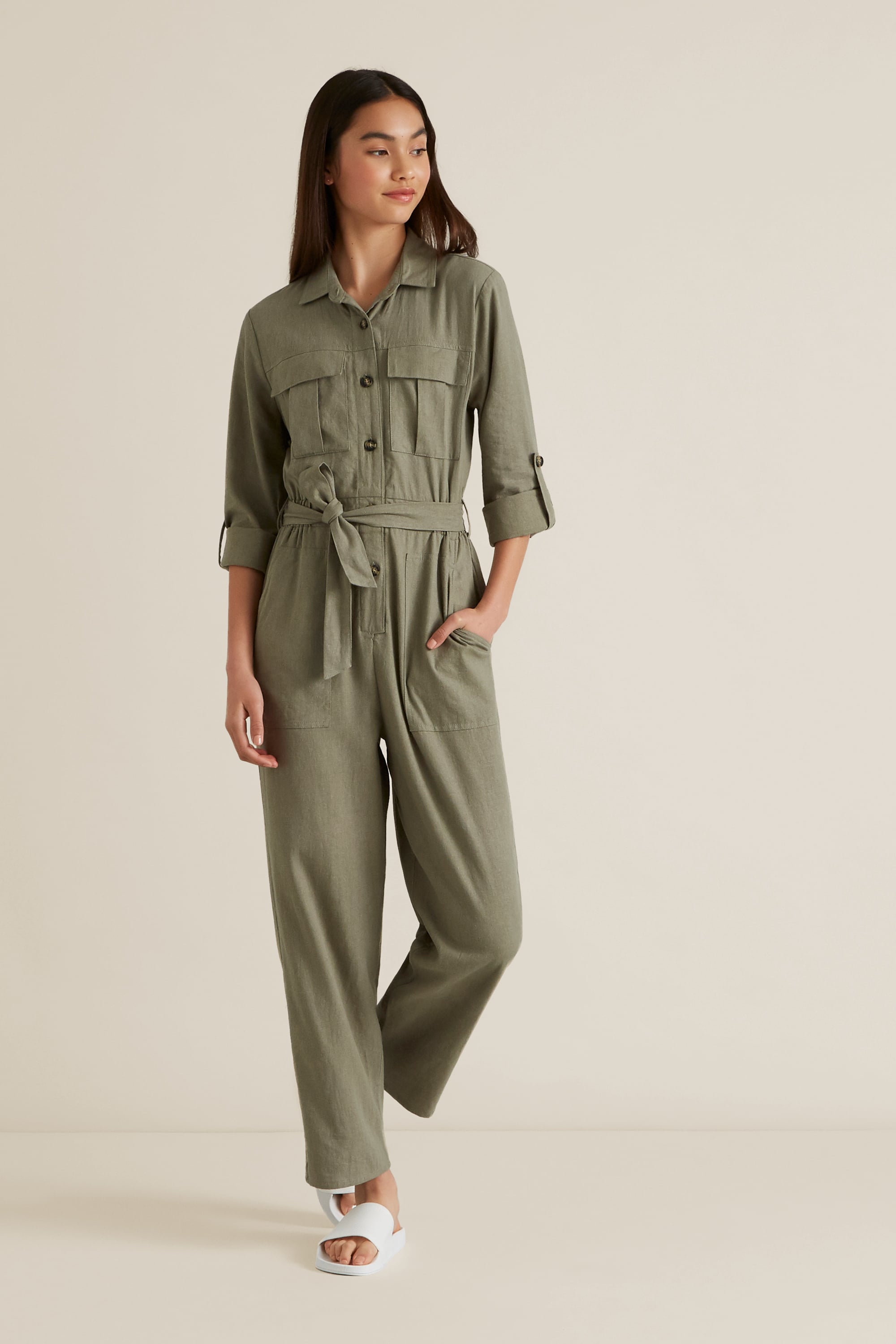 This trending Utility Boiler Suit is a day-to-night classic wardrobe piece. Featuring a collared lapel, it is designed with four functional pockets, long cuffed sleeves, gathered waistline and long pants. Crafted from a woven Linen/Viscose blend, this suit is available in size 8 to 16. For your reference, our model is 173cm and wears a size 14. Check the label inside of the garment for care information.