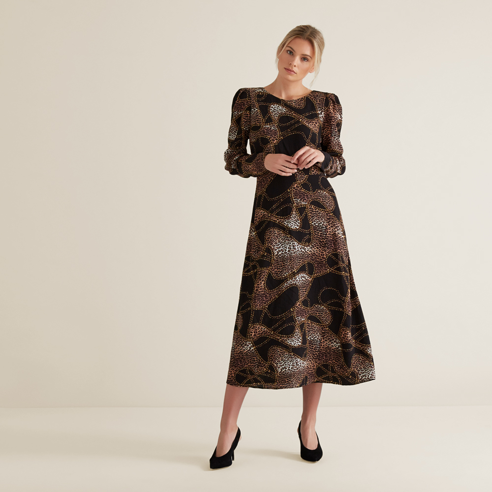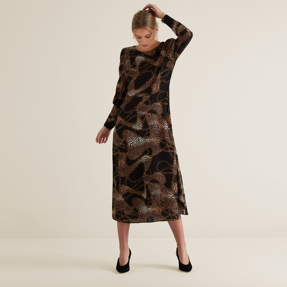 This V-Back Dress sports a statement chain print design, crew neckline, and midi length hemline. It features a low back design fitted with an invisible zip closure for a polished luxe look. Made from a double lined Polyester/Elastane blend and in a crepe textured feel, this V Back Dress is available in sizes 6 through to 14. Our model wears a size 8 and is 177cm tall. Care instructions can be found inside of the garment.
